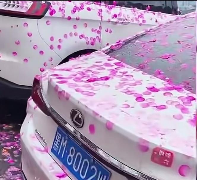 年前年后,这段时间办喜事的人家不少。为营造喜庆隆重的氛围,越来越多的家庭会购置一些彩色礼花弹燃放。 然而,因礼花弹质量参差不齐,部分飘落的纸屑遇水会掉色,这无形中给举办喜事的人家增添了麻烦。 就如下面画面呈现的场景,几辆汽车的外壳被粉红色纸屑覆盖。若在大晴天倒还好,偏偏赶上下雨天,车身仿佛被喷了一层花样漆。现场有人伸手去擦,却怎么也擦不掉。 要是这些车的主人是亲戚朋友,还好商量;可要是陌生人的车,除了赔礼道歉,还得帮忙清洗干净。 由此可见,办喜事放烟花得选好地方,既要考虑安全问题,又要避免给他人带来不便,否则,只会自找麻烦。 婚庆派对礼花