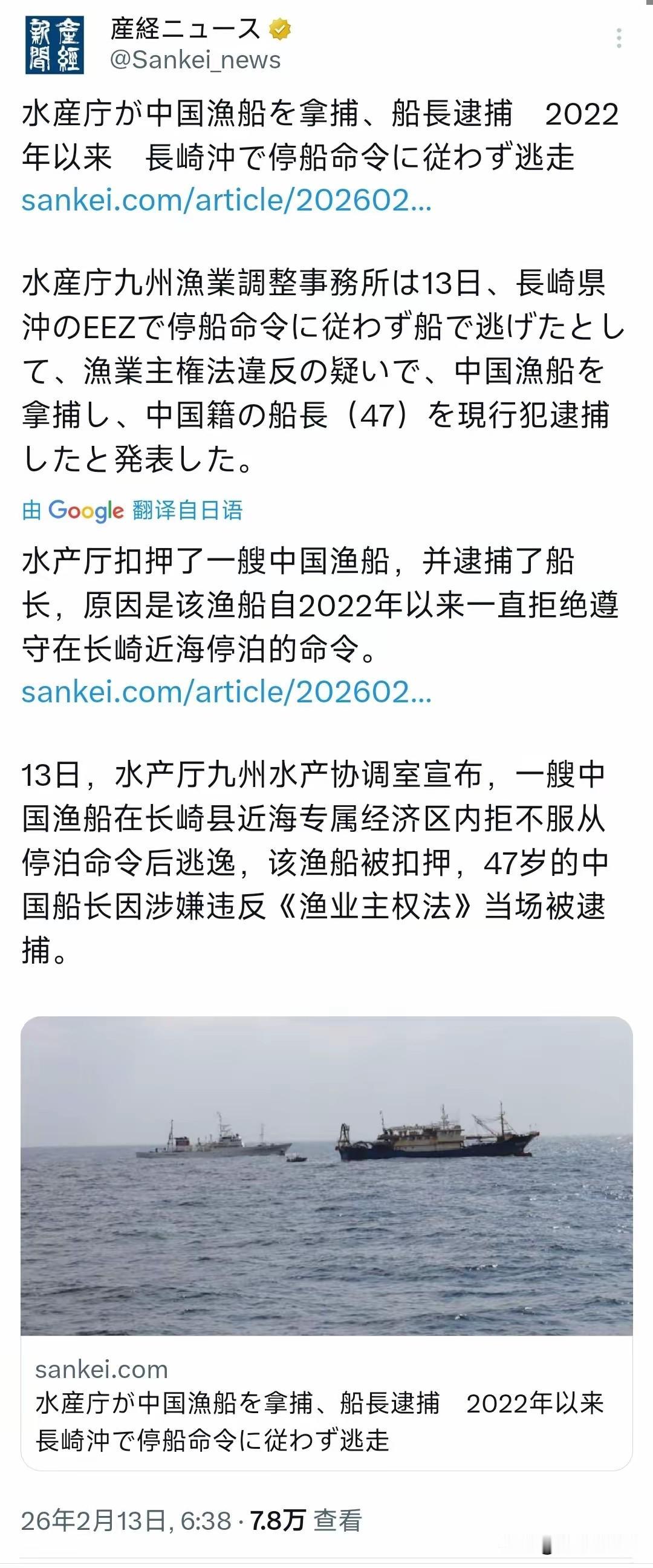 动真格了!日本扣押中国渔船逮捕船长,4艘炮艇围堵11名渔民,这是试探谁的底线? 2026年2月13日,一则消息从东京传出:日本水产厅在长崎近海扣押中国渔船,47岁的中国船长当场上铐带走。 4艘日方执法船围堵1艘中国渔船,11名中国渔民被强行拦截。日方宣称这是“今年首次扣押外国渔船”,更是“2022年以来首次扣押中国大陆渔船”。言辞之间,竟有几分炫耀之意。 消息很短。但事情很大。 小日本,你这是试探谁的忍耐心? 一、“拒不服从”?先问问这片海到底是谁的 日方通报里反复强调一个词:专属经济区(EEZ) 。 长崎县五岛市女岛西南约165公里——他们言之凿凿,说这里是日本的EEZ。中国渔船“非法作业”“拒不服从停船命令”,所以必须“毅然应对”,所以必须“当场逮捕”。 问题是:你说这是你的,就是你的? 东海划界问题,中日谈了二十年都没谈拢。中国始终坚持《联合国海洋法公约》确立的大陆架自然延伸原则——东海大陆架一直延伸到冲绳海槽,那是中国固有的管辖海域。日本呢?硬塞一条自己画的“中间线”,国内法一立,就当成了国界。 国际法不是谁嗓门大就听谁的。日本这条线,中国从没承认过。 既然存在划界争议,日方哪来的底气在争议海域搞“单边执法”?哪来的权力对中国渔民“当场逮捕”?这不是依法维权,这是拿着自己画的图纸,拆别人家的房子。 二、时间点太巧,目标太准,手法太狠 消息一出,有几个细节扎眼: ——4艘执法船,围1艘渔船。通报里清清楚楚写着:白鸥丸、那之津、武藏、白萩丸。围追堵截、强行拦截。这不是执法,这是海上伏击。 ——47岁船长当场逮捕。11名船员眼下状况不明。日方一边说“正在调查”,一边又拒绝透露船长是否认罪。 ——上一次扣中国大陆渔船是2022年。时隔四年,偏偏在这个节骨眼上重启。 哪个节骨眼? 就在两天前,中国驻日大使吴江浩直言:当前中日关系面临邦交正常化以来最为严峻复杂的局面,责任完全在日方。 话音刚落,这边就动手了。 这是执法?这是掐着秒表搞政治报复。 三、“台湾渔船随便扣,大陆渔船更敢扣”?这是试探底线 更值得警惕的是:这不是日方近期唯一的动作。 就在几天前,台湾地区“红彩头6号”渔船被日本公务船抓扣,家属交了巨额保释金才放人。外交部明确表态:根据《中日渔业协定》,日方无权在有关水域对中方渔船采取执法措施。 措辞很重,立场很清楚。 但日本听进去了吗? 没有。不但没收敛,反而升级了——从扣台湾渔船,到扣大陆渔船;从罚款驱逐,到当场逮捕。 这不是偶然事件,这是清晰的政策递进。 有些人以为,扣台湾渔船“风险低”,中方反应“有限”。试探完了,觉得不过如此。现在把手伸向大陆渔船,47岁船长直接戴手铐。 小日本这是在一步步试探:到底做到哪一步,中国才会真正动怒? 四、“调查”是假,政治操弄是真 日方内阁官房长官木原稔的表态很耐人寻味:“今后也将以毅然决然的态度加以应对。” “毅然决然”——这四个字,应该送给谁? 中国渔船是不是真的进了争议海域?进了多少米?是不是真的从事了日方指控的作业?这些最核心的事实,日方只说“可能以非法捕捞为目的”,证据呢? 一家之言,单方通报,没有任何中立第三方核实。日本媒体统一口径,官方自说自话,这叫“执法”?这叫栽赃。 更可笑的是,日本一边在东海扣押中国渔民,一边却在国际上装“和平主义者”。就在去年和今年,日方还接连抗议中国在东海的油气开发,说中国“单方面改变现状”。 双标玩到这个份上,脸都不要了。 五、底线不是用来试探的,是用来捍卫的 中日邦交正常化五十多年,风浪见过不少。但像今天这样日方主动升级、挑衅递进、执法与政治联动的局面,确实罕见。 这不是渔民的问题,这是国与国的较量。 今天扣一艘渔船抓一个人,明天是不是要在争议海域搞常态化抓扣?今天用4艘船围堵,明天是不是要用更激进的武力手段? 每一步试探,都踩在红线边缘。 我们一贯讲守法,讲规则,讲通过协商解决争议。中方渔船如果真有过错,依法处理,我们认。但如果是拿着单方面划的线、单方面立的法,搞选择性执法、政治性报复——对不起,这事没完。 11名渔民,47岁船长,背后是11个家庭,是一个国家的尊严。 小日本听好了: 中国的海,不是你撒野的地方。 中国人的渔民,不是你“试探底线”的耗材。 所谓的“毅然决然”,中方比你更懂什么意思。 底线这东西,试探一次,就是挑衅一次。 忍让不是软弱,是给你留余地。但余地是有限的。 你猜,下一步是什么? (本文综合NHK、共同社、观察者网、外交部公开表态等信息源,坚持原创立场,不转载任何侵权内容。真相待厘清,立场不退让)。