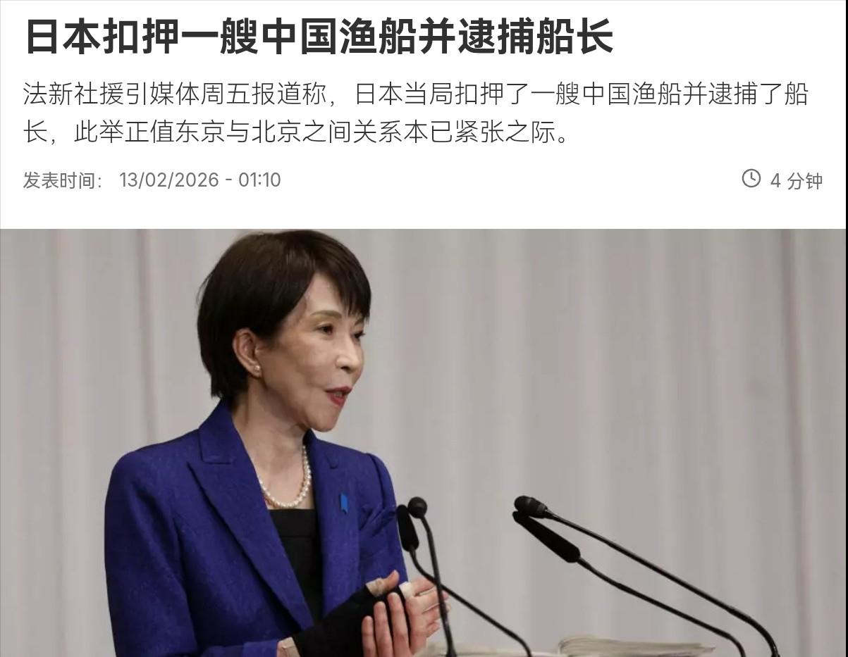非常嚣张!日本对中国渔船进行扣押,并逮捕船长!2月13日,根据法新社报道,法媒称日本当局扣押了一艘中国渔船并逮捕了船长,此举正值东京与北京之间关系本已紧张之际。日本渔业厅表示,该船在日本长崎县(西南部)外海的“专属经济区”内无视停船命令。中国船长接到渔业检查员的停船检查命令,但该船未予配合并逃离现场。因此,船长被逮捕。 根据日本媒体的补充报道,这次被扣押的渔船是一艘虎网作业船,船上一共有11名中国船员,都是靠出海捕鱼谋生的普通从业者,被逮捕的船长今年47岁,而日方出动的可不是一艘执法船,而是足足4艘专业执法船,对咱们这一艘普通渔船进行围追堵截,最终才强行完成扣押,这个阵仗,根本不像是常规的渔业检查,更像是一场有预谋的针对性行动。 日方一口咬定,扣押渔船的理由是该船进入了其所谓的“专属经济区”,还无视停船命令逃逸,违反了日本的《渔业主权法》。 但这里有个最关键的问题:日本单方面划定的这片“专属经济区”,中国从来就没有承认过,而且这一立场完全符合国际法准则。 值得注意的是,这次事件发生的海域,是长崎县外海的东海传统作业区,咱们中国渔民在这片海域捕鱼,已经有几百年的历史了,这不仅是传承下来的生产方式,更是很多沿海家庭唯一的生计来源。 一艘普通的捕捞渔船,承载着十几个家庭的希望,船员的薪资、渔船的燃油和维护费用,全靠海上捕捞的渔获来支撑,他们出海作业,只是想靠自己的劳动换取合法收入,根本没有触碰任何违规红线。 日方口口声声说“执法”,实则是在践踏中国渔民的合法权益,更是在侵犯中国的海洋主权。 而且大家别忘了,这次事件发生的时间点非常微妙,正值中日关系面临邦交正常化以来最严峻复杂的局面。 就在事件发生前两天,中国驻日大使吴江浩还公开表态,当前中日关系的困局,责任完全在日方。 最近一段时间,日方在涉华问题上动作不断,一边配合外部势力对华施压,一边在海洋领域频繁开展激进行动,还在舆论上炒作所谓的“海洋威胁”,一步步破坏中日双方的互信基础。 这次扣押中国渔船,显然不是一次简单的渔业执法,而是日方激进对华政策的具体体现,目的就是试探中国的底线,进一步加剧双边关系的紧张。 可能有朋友会问,日本为什么偏偏盯着东海的渔业资源,盯着中国渔船不放?其实背后的逻辑很简单,日方就是想通过控制渔业作业权,来推进其单方面的海域主权主张,把经济层面的资源争夺,和政治层面的主权博弈绑在一起,借渔业纠纷实现海洋扩张的目的。 从日方的执法数据就能看出来,2025年他们只扣押了2艘外国渔船,还都是中国台湾地区和韩国的,而2026年开年还不到两个月,就直接对中国大陆渔船动手,而且动用4船围堵单船的极端方式,其针对性不言而喻。 面对日方的嚣张行径,中方的立场一直非常明确且坚定:国家主权不容侵犯,中国渔民的合法权益也绝对不容损害。 中国驻日大使吴江浩早就明确表示,中方有足够的能力和坚定的意志,捍卫国家的核心利益。 接下来,中方必然会通过外交渠道,向日方提出严正交涉,要求其立即释放被逮捕的船长,妥善安置其余10名船员,归还被扣押的渔船和相关财产,弥补中国渔民的损失。 说到底,这次渔船扣押事件,看似是一场渔业纠纷,实则是中日双方在海洋权益、地缘政治上的一次博弈。 日方无视国际法准则,无视双方的历史共识,单方面采取激进行动,最终只会搬起石头砸自己的脚。 对于咱们普通人来说,我们要清楚,中国渔民在东海的合法作业,受国际法和中国法律的保护,日方的非法扣押行为,既得不到国际社会的认可,也必然会遭到中方的坚决反制。 希望日方能够认清形势,停止一切挑衅行为,通过平等协商解决双方的海域分歧,否则,只会让本就脆弱的中日关系,陷入更深的僵局。