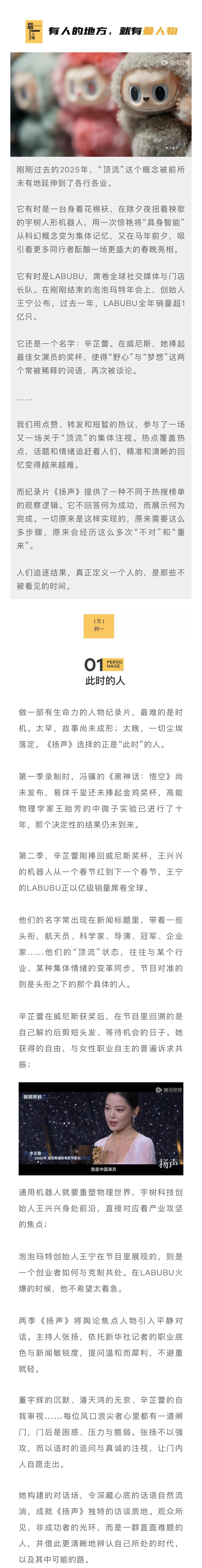 而纪录片《扬声》提供了一种不同于热搜榜单的观察逻辑。它不回答何为成功,而展示何为完成。一切原来是这样实现的,原来需要这么多步骤,原来会经历这么多次“不对”和“重来”。 人们追逐结果,真正定义一个人的,是那些不被看见的时间。