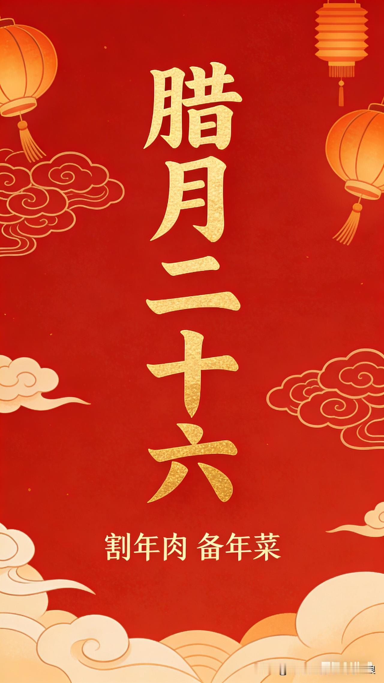 今天是腊月二十六,老话说:二十六,割年肉。家家户户开始备年货、买猪肉、炖肉、炸丸子,厨房里热气腾腾,满是过年的香味。 这一天,大家忙着洗干净衣服,打扫卫生,把一年的疲惫都洗掉,干干净净迎新年。街上集市热闹,家里烟火气足,日子越过越顺。 腊月二十六,备好吃的,洗去旧尘,愿大家平安顺利,阖家幸福,新年更红火! 腊月二十六 年味渐浓 图片由AI生成