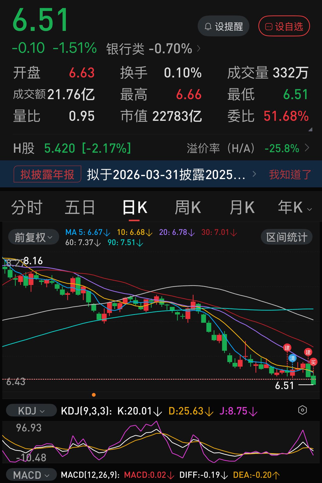 虎口拔牙失败。 昨天下午在6.61元挂单买农业银行,在尾盘以全天最低价6.61买入农业银行,收盘价6.61元。 收盘后,看了一下日K线,是破位形态。但是,周K线最近三周都有较长上影线,三周累计跌幅不大,感觉还是有机会,至少不会深套。 今天早上6.63高开,直接挂了6.67卖单。奈何,最高冲到6.66,差一分未成交。 综合分析:执行力太差。 昨天看到破位,原本计划只要高开,直接挂个6.62,不亏手续费就卖,平稳过节。 结果,今天真就走出了破位走势。 最无奈的是,盘中居然还在6.57、6.52两次补仓。 目前成本5.58。