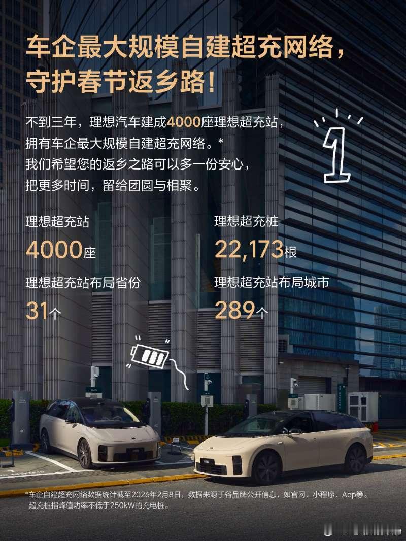 1、国内超充(250kW及以上)站建设最多的车企! 截至目前,理想超充站共完成全国建站4000座,其中1200座高速服务区超充站,不论你是返乡还是自驾游,不下高速就能享受到最好的超充服务!