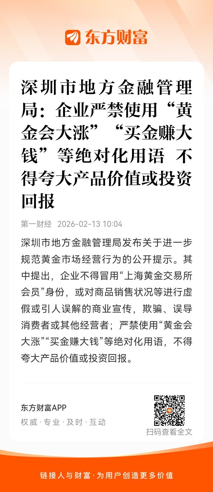 东方财富股票【深圳市地方金融管理局:企业严禁使用“黄金会大涨”“买金赚大钱”等绝对化用语 不得夸大产品价值或投资回报】深圳市地方金融管理局发布关于进一步规范黄金市场经营行为的公开提示。其中提出,企业不得冒用“上海黄金交易所会员”身份,或对商品销售状况等进行虚假或引人误解的商业宣传,欺骗、误导消费者或其他经营者;严禁使用“黄金会大涨”“买金赚大钱”等绝对化用语,不得夸大产品价值或投资回报。网页链接 (来自