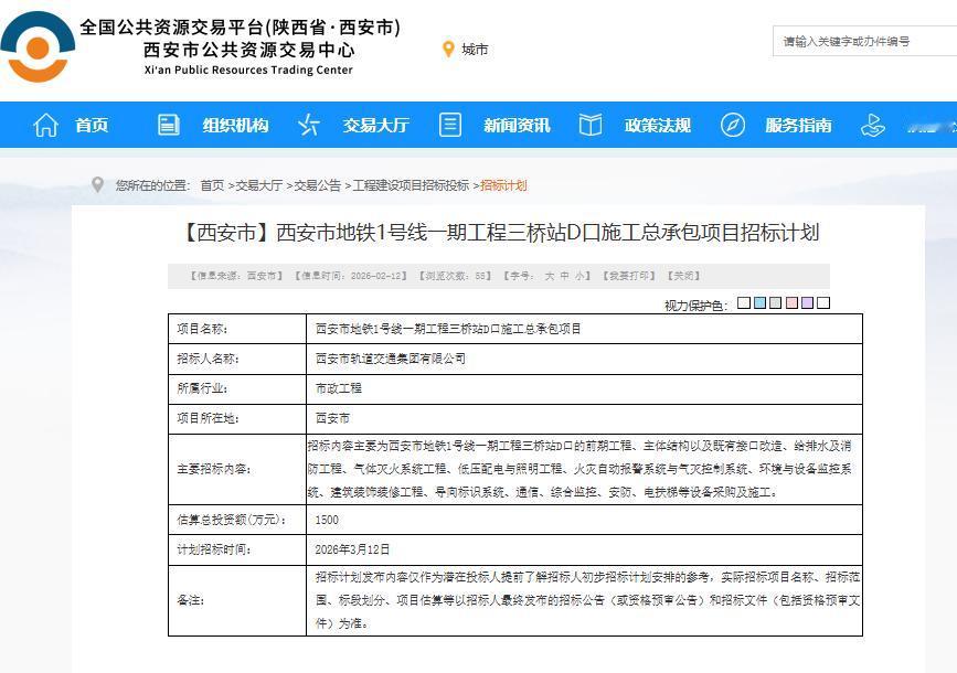 好消息!迟到近13年,西安这个地铁口迎新进展,招标计划发布.... 日前,西安公共资源交易中心发布《西安市地铁1号线一期工程三桥站D口施工总承包项目招标计划》,内容显示: 西安市地铁1号线一期工程三桥站D口施工总承包项目招标人为西安市轨道交通集团有限公司,估算总投资额 1500万元; 招标内容主要为西安市地铁1号线一期工程三桥站D口的前期工程、主体结构以及既有接口改造、给排水及消防工程、气体灭火系统工程、低压配电与照明工程、火灾自动报警系统与气灭控制系统、环境与设备监控系统、建筑装饰装修工程、导向标识系统、通信、综合监控、安防、电扶梯等设备采购及施工。 据悉,西安地铁1号线于2013年9月投入运营,三桥站D出入口位于三桥新街北口,自线路运营以来,因拆迁补偿安置问题,始终未能开通使用。周围三桥大厦、鸿港国际、天玺龙景、中建开元城等小区和办公楼市民出行,只能过马路去B/C口坐地铁,“特别不方便”。 2025年11月,西安市轨道交通集团有限公司最新回复确认 ,三桥地铁站D口此前因拆迁补偿安置问题未完成,尚未移交至市轨道集团。为加快地铁建设,改善区域环境,在西咸新区管委会协调推动下,三桥地铁站D口已于10月25日完成部分场地移交,目前正在同步开展场地勘探施工,并张贴说明。D口现阶段处于施工前期准备阶段,待用地完全移交后即可施工,具体开通时间将根据后续施工进展确定。