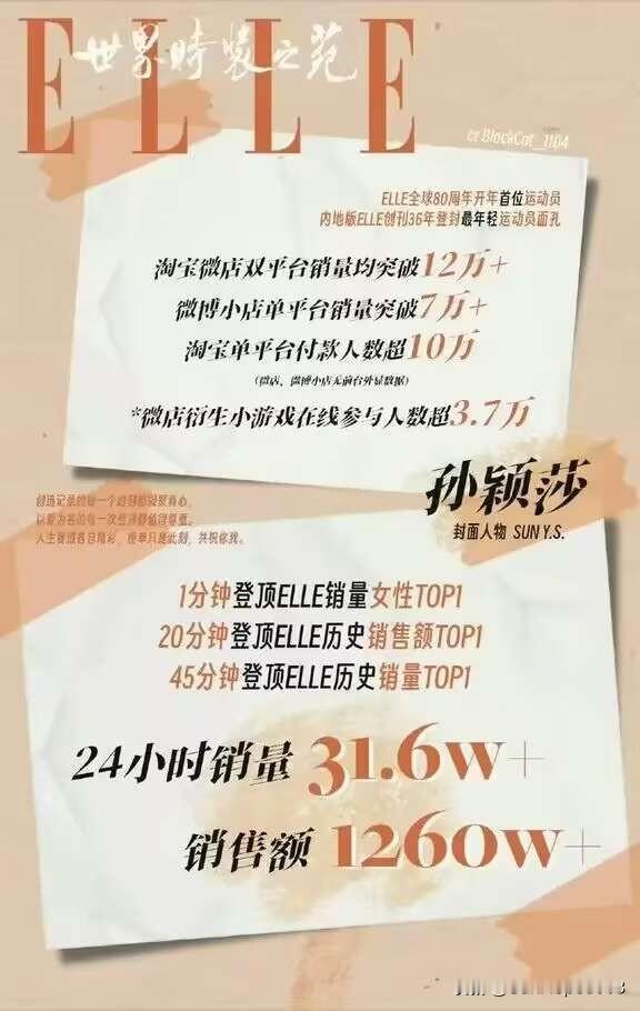 孙颖莎ELLE杂志24小时销量突破30万。 ELLE开季刊封面是孙颖莎,双封面,一共三版, 在昨天开始销售,截至目前24小时, 销售创造了ELLE的多项历史,突破30万。 莎莎一共拍摄了五本,全是五大,把所有的销量进行了汇总, 短短一年半的时间,拍摄了五本,并且还有目前的销量, 也就是孙颖莎可以了!