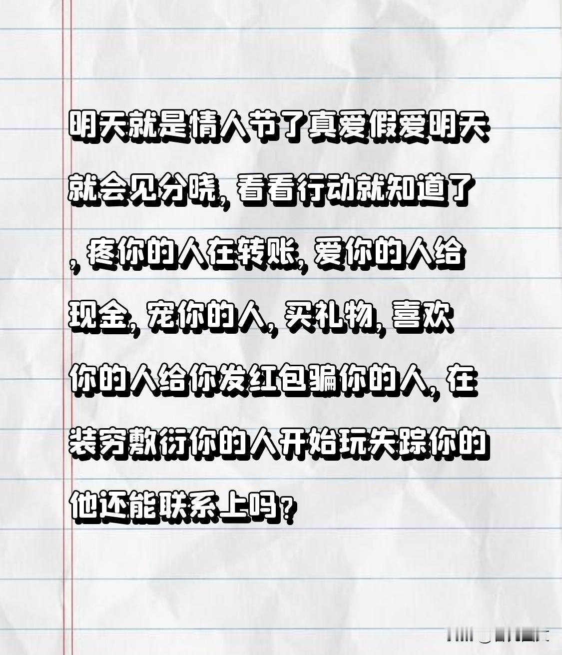 明天就是情人节了 真爱假爱明天就会见分晓, 看看行动就知道了, 疼你的人在转账, 爱你的人给现金, 宠你的人,买礼物, 喜欢你的人给你发红包 骗你的人,在装穷 敷衍你的人开始玩失踪 你的他还能联系上吗?