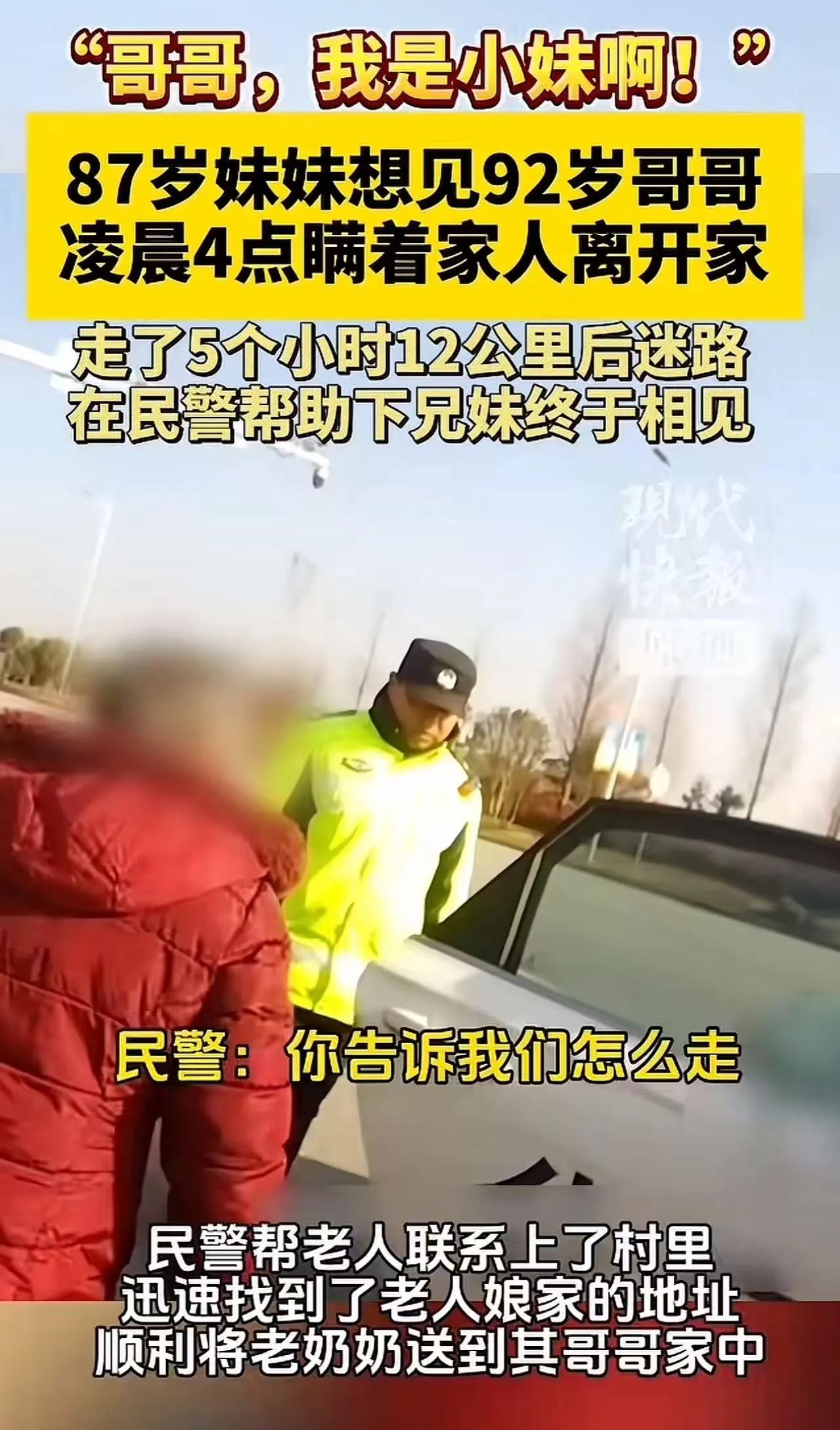 “这位87岁奶奶火了!”凌晨四点多,曹奶奶拄着拐杖,没跟家里人打招呼,就从苏何村那边出了门,目标很明确:去娘家,去见92岁的哥哥。 路其实不近,说是二十公里。她走着走着,天亮了,风也起来了。她记得以前的路,可几年没走,路改了,岔口多了,她越走越没底。到上午十点左右,人就撑不住了,坐在国道边歇着,手里还攥着拐杖,车来车往,看着就让人心里发紧。 巡逻民警上前问她去哪,她回得很简单:去我妈妈家。 这句话听着像“糊涂”,可细想又很清楚:妈妈早不在了,但“娘家”还在,哥哥还在。对她这种年纪的人来说,“想妈妈”不一定是字面意思,更像是一种方向感——我得回到那个地方,回到我小时候待过的院子、门槛、那群亲人那里。 这事发生在东台,属盐城。执勤的是东台市公安局交管大队头灶中队,民警丁月飞把老人扶起来,先安抚情绪,又一点点问信息。老人能说出来的也有限:只记得村名、哥哥的名字,别的细节记不牢了。 这时候就看出来“办事能力”是怎么回事:不是把人往车上一塞就完了,而是联系村干部核对位置,确认了哥哥在金灶村,然后一路把她送过去。车上还得一直跟她聊家常,让她别慌,也让她慢慢把信息“挤”出来。 到了院子门口,老人一下就认出来了。92岁的哥哥出来,两个人见面那一下,不用太多形容,谁看都明白。她喊了一声“哥哥,我是小妹”,人这辈子能把这句话喊出口的次数,其实越来越少。 但这事也不是只有“感动”这么一面,我反而更愿意把账算清楚。 有人说:这也太危险了,老人怎么能自己跑这么远?摔一下、迷路一下,后果谁担? 这话不刻薄,是现实。87岁拄拐,走五个小时,十多公里,路边还全是车。对年轻人叫“说走就走”,对老人就可能是“走失”。一旦天再冷一点,或者她没被及时发现,事情就不是热搜里的温情了。 也有人把矛头对准家里:子女怎么没看住?怎么能让老人凌晨出门都不知道? 我能理解这种着急,但也得承认,很多家庭真不是“不管”,而是“管不过来”。白天要上班,老人白天看起来挺正常,夜里忽然起念头,轻手轻脚就出门了。你装门铃、装监控、反锁门……看似管住了,可老人心里那股想见人的劲儿,没消失,只是憋着,憋久了反而更容易出事。 还有人说:这种新闻别老发,发多了,大家就只剩下“看哭了”,看完也就完了。 我觉得这句话也有道理。哭完就散,没留下任何“可操作”的东西,那就真浪费了。 这事里最值得被看见的,其实有两点。 一是老人的需求很具体:她不是要买东西,不是要闹情绪,她就是要见哥哥。她说“想妈妈”,背后是“我得回去一趟”。这种需求很朴素,也很硬。你拿“安全”去压她,她未必听得进去,因为她心里算的账是:见一面少一面。 二是现场处置很务实:先把人从危险路边带离,先把情绪稳住,然后用最短路径把信息核实到位,最后把人交到家人手上,还不忘提醒以后别单独出门。这个流程看起来简单,其实挺考验耐心和细节。 站在普通人角度,我的观点也直白:这位奶奶的“执拗”值得心疼,但“模仿”不值得鼓励。 心疼,是因为她那股回娘家的念头太真实,真实到把五小时的路当成“必须走的一趟”。可鼓励就不行,因为成本太高,风险太大,不能拿侥幸去赌。 真要从这事里学点东西,落地的办法反而很家常: 家里有高龄老人,衣服口袋里放一张卡片写清姓名、住址、联系电话,别嫌土。手机不一定会用,卡片大概率能用上。 能陪就陪一次,尤其是那种“她反复念叨的地方”。你陪她去一趟,比你劝一百次“别乱跑”管用。她心里那根弦松了,后面反而更愿意听你的安全安排。 社区、村里也可以做得更细一点:邻里互相留个电话,老人常走的路口多留意,哪怕只是多问一句“您去哪”,都可能把风险按下去。 说到底,这不是“老人不懂事”,也不是“子女不孝顺”就能概括的事。它更像是提醒我们:老人要的很多时候不是被看管,而是被认真对待——她想见的人,她想走的路,她心里那个“娘家”的方向。 这回是民警巡逻碰上了,运气站在她这边。可我们不能次次等运气。