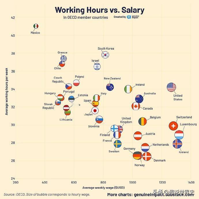 OECD国家的平均每周收入(横轴)和平均每周工作时长(纵轴)对比 墨西哥已经是卷王了,也是唯一一个周工作时长超过40小时——按8小时工作制算每周工作5天——的国家。以及在北欧5国里,冰岛独一档(活少钱多),挪威丹麦次一档,瑞典芬兰垫底。国外收入水平 各国收入中位数 OECD(Organization for Economic Co-operation and Development,中文名:经济合作与发展组织),是由38个市场经济国家组成的政府间国际经济组织,于1961年9月30日成立,总部设在法国巴黎。