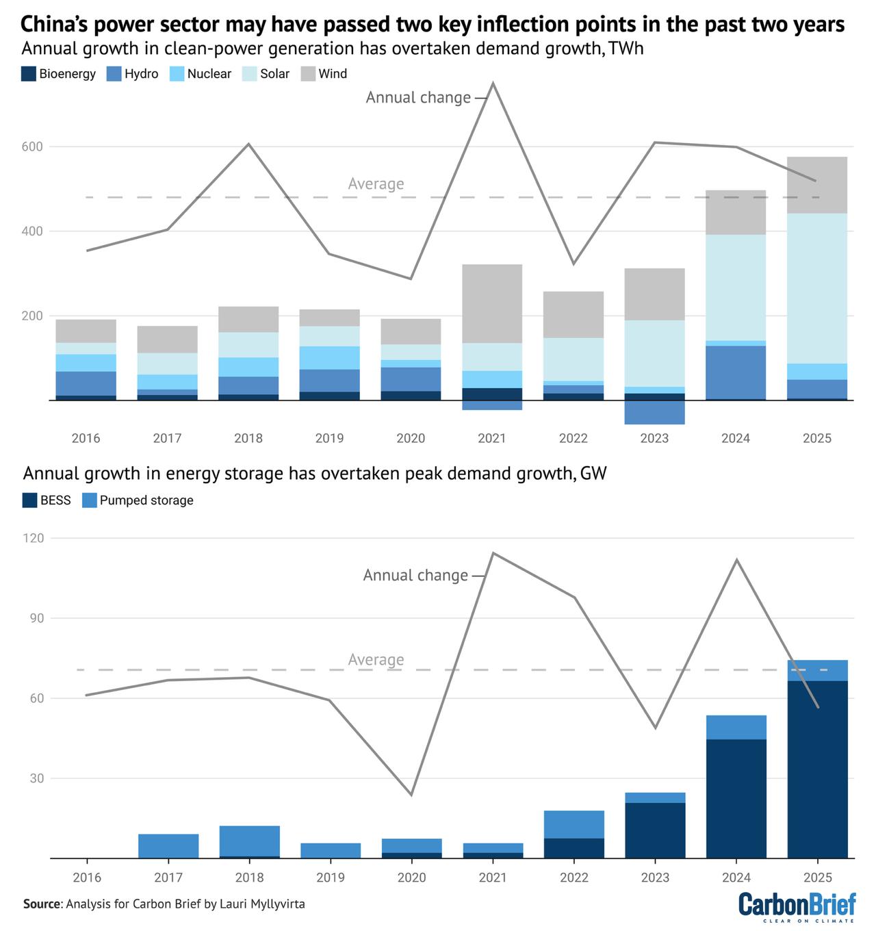 最新分析显示,中国二氧化碳排放已连续21个月处于“持平或下降”状态。2025年第四季度同比下降1%,全年预计小幅下降约0.3%。其中,化石燃料相关排放微增0.1%,但水泥行业排放下降7%抵消了这一增幅。分行业看,2025年交通运输排放下降3%,电力下降1.5%,建材下降7%,金属行业下降3%;化工行业则因煤炭和石油使用分别增长15%和10%,带动排放上升12%,成为主要例外。与此同时,太阳能发电量同比增长43%,风电增长14%,核电增长8%,带动煤电发电量下降1.9%;储能装机容量新增75吉瓦,超过用电峰值增幅。数据还显示,2025年中国单位GDP的化石能源碳强度同比下降4.7%,2020年至2025年累计下降约12%,但仍低于“十四五”规划设定的18%目标。若要实现《巴黎协定》相关承诺,未来五年碳强度需再下降约23%。政策层面是否继续保持减排力度,将在今年3月全国“两会”上审议批准的“十五五”规划中更加明朗,这也将影响外界对中国排放是否已达峰、抑或将在2030年前后再创新高的判断。 图片来源于网络