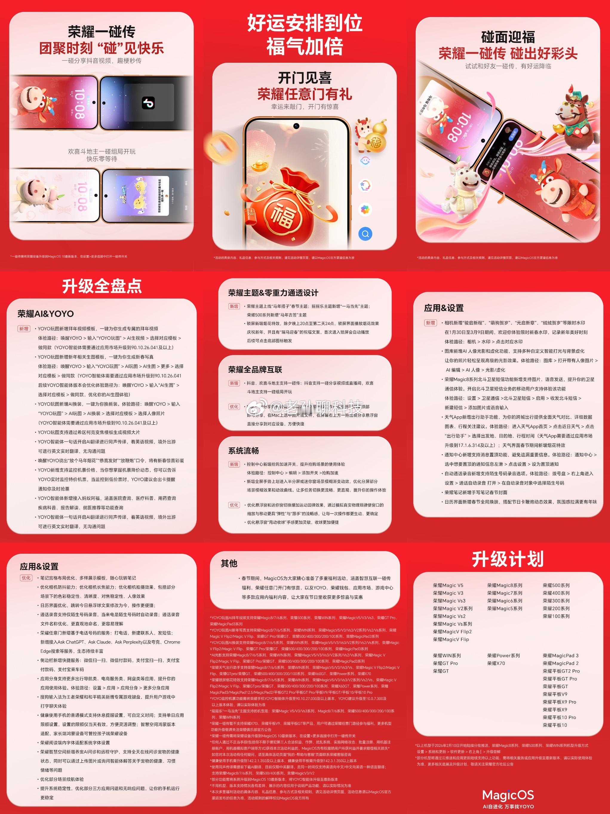 荣耀MagicOS 10系统2月新春特别版更新来了,这一次不仅覆盖了春节的游玩出行场景,还有更多彩蛋。包括YOYO,帮忙生成拜年视频和新春对联等。还可以一碰斗地主,一碰刷抖音,更多灵动胶囊功能都安排上了,覆盖机型最早可以追溯到荣耀Magic5系列和荣耀100系列,几年前的老机型也没有忘,荣耀这一波更新很良心。MagicOS月月新新年荣耀AI到福到