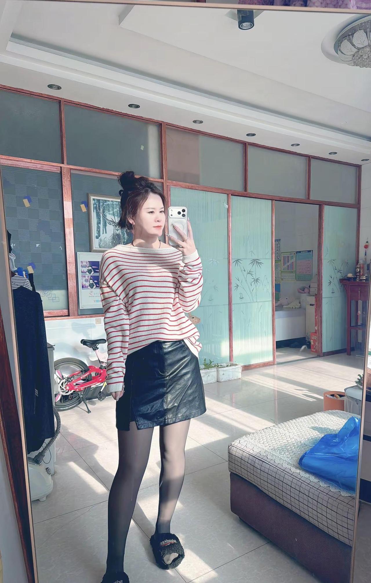 今日穿搭小短裙对镜拍穿搭皮裙今日穿搭look