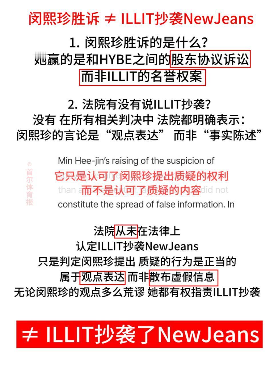 ❗闵熙珍赢的,是HYBE告她的那场股东诉讼,而不是blft告她的名誉侵权案。❗法院从头到尾没有在法律上认定illit抄袭njs。判决的意思是:闵熙珍公开说“illit抄袭”,这是她的个人观点,不算散布虚假信息,所以不构成诽谤。✅换句话说,法院认可的,是闵熙珍提出质疑的权利,而不是她质疑的内容本身。