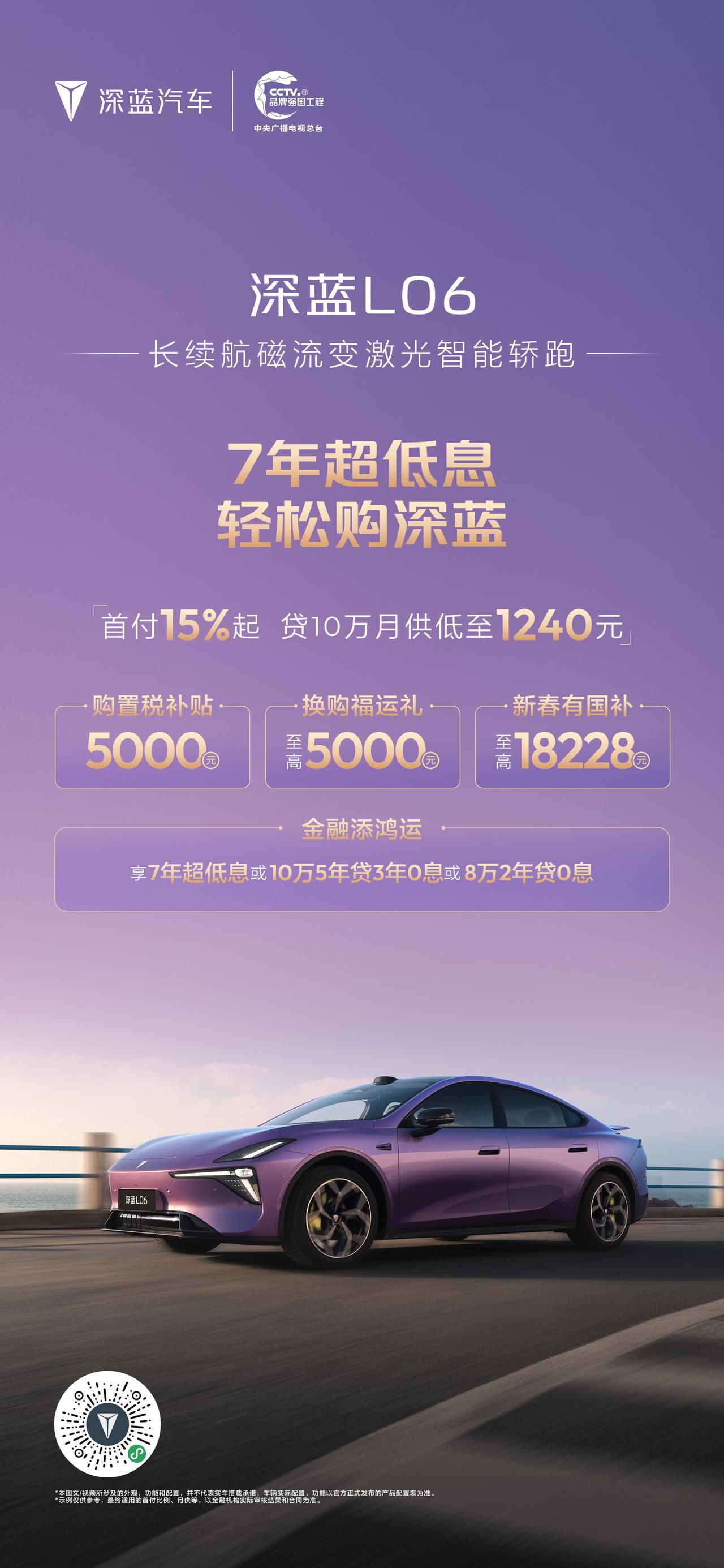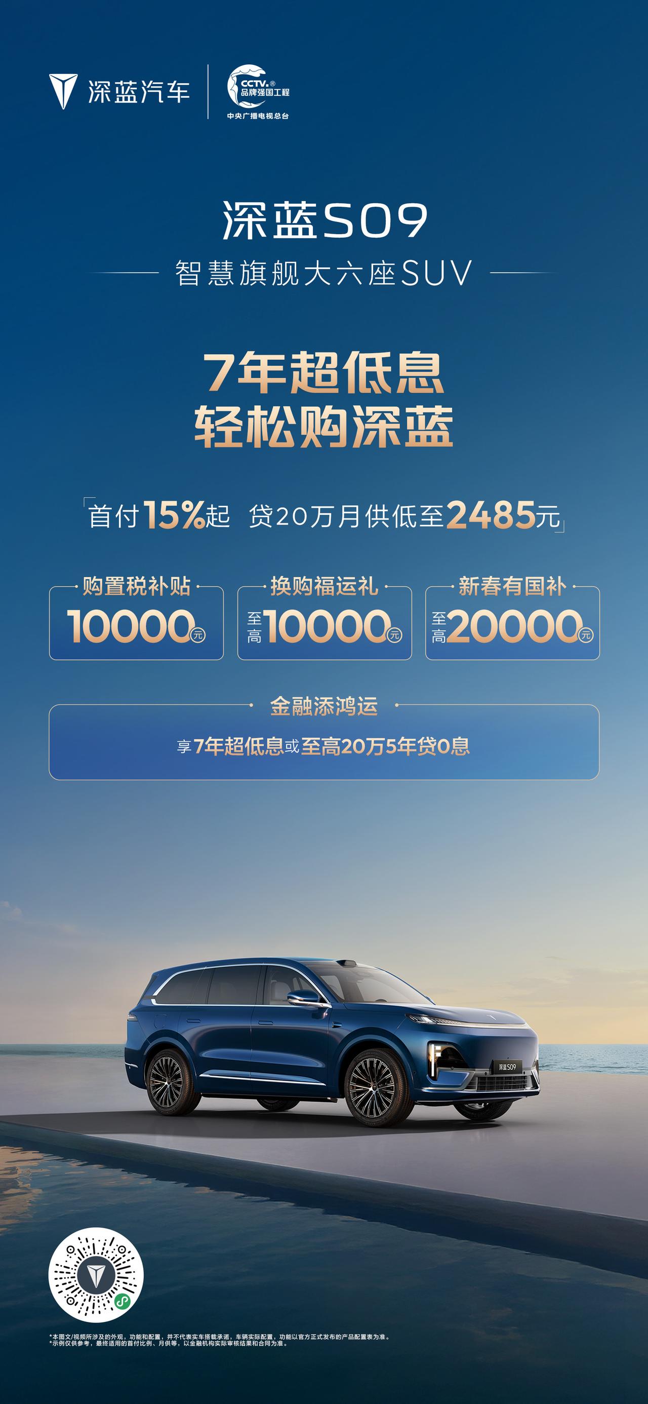 深蓝汽车新春推出“7年超低息 轻松购深蓝”专属金融政策,降低用户购车门槛,助力消费者轻松开起新年旅程。消费者可享“首付15%起月供低至1240元”的7年超低息方案,轻松拥有长续航座驾。同时,活动叠加多重限时礼遇:包括至高10000元购置税补贴、20000元新春国补红包及10000元换购福运礼,以极具诚意的金融方案与全方位补贴,守护每一段安心出行。