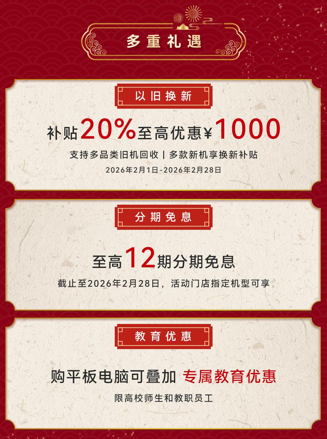 @余承东 今日通过视频分享年度好物,盘点年度推荐的华为产品。正在进行的华为感恩回馈季,即日起至2月28日,礼遇多多。其中,手机至高优惠2000元,为消费者新春换新提供优惠选择。华为电子年货 活动覆盖多款热门产品,包括华为Mate80系列、nova15系列、Pura80系列、Pura X系列、Mate XTs等,还有华为手表、耳机、平板等全场景产品。参与以旧换新,可叠加享受至高1000元补贴,并支持至高12期分期免息。
