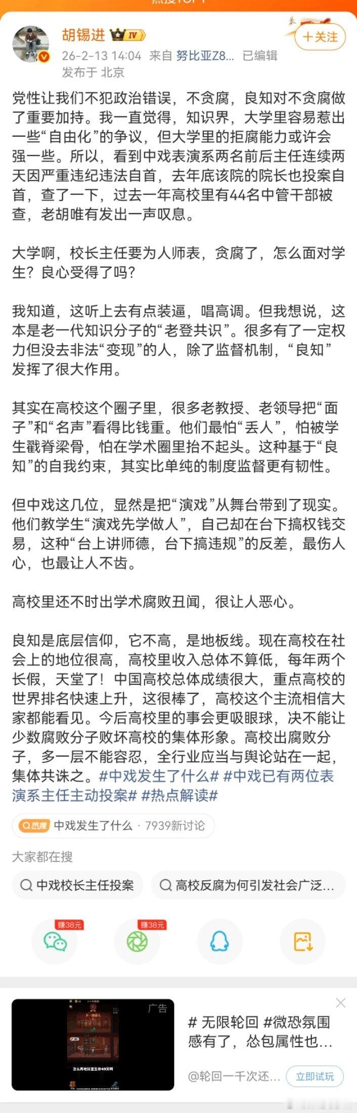 胡锡进:我一直觉得,知识界,大学里容易惹出一些“自由化”的争议,但大学里的拒腐能力或许会强一些。