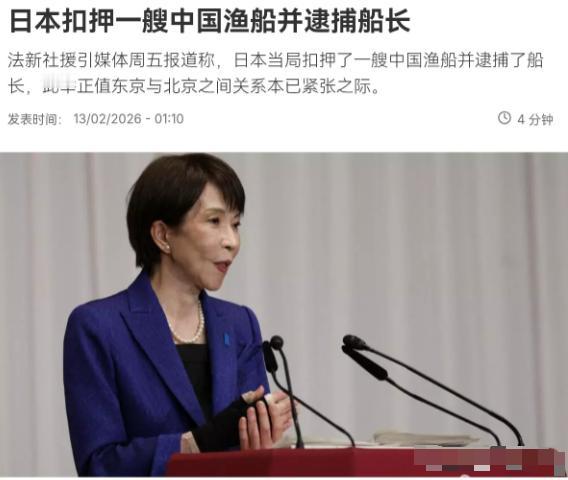 非常嚣张!日本对中国渔船进行扣押,并逮捕船长!2月13日,根据法新社报道,法媒称日本当局扣押了一艘中国渔船并逮捕了船长,此举正值东京与北京之间关系本已紧张之际。日本渔业厅表示,该船在日本长崎县(西南部)外海的“专属经济区”内无视停船命令。中国船长接到渔业检查员的停船检查命令,但该船未予配合并逃离现场。因此,船长被逮捕。 日本方面一口咬定事件发生在日本长崎县(西南部)外海的“专属经济区”,而这也是自2022年以来日本渔业局首次扣押中国渔船。很显然,日本方面的行为非常的嚣张。 所以这件事的本质,根本不是“中国渔船闯入日本海域”,而是日本用国内法去管一片本不该由他们单方面说了算的水域。说白了,这就是执法权的越界,外加一次精心计算的“试探”。 这次行动发生在2月12日,而就在两天前,也就是2月10日,中国驻日大使吴江浩刚刚说了一句非常重的话:当前中日关系面临邦交正常化以来最为严峻复杂的局面,责任完全在日方。 这话说得很直接了,而且吴大使还特意点了一句:日本右翼势力80年来一直在鼓吹“正常化国家”,潜台词是什么?——战后的和平体制你们一直想挣脱,周边国家都看在眼里。 从昨天那四艘执法船的动作来看,他们不仅听进去了,还以实际行动作出了回应。只是这个回应的方式,不是降温,而是加柴。 更值得注意的是时间线。去年11月,日本首相高市早苗在国会答辩时,公开把台湾问题跟“日本存立危机事态”挂钩,当时我们就召见了日本大使,也暂停了日本水产品的进口。那一轮交锋还没翻篇呢,现在又拿渔船说事。 而且这一次针对的是中国大陆渔船。根据日本水产厅自己公布的数据,2025年他们扣押了两艘外国渔船,一艘是台湾地区的,一艘是韩国的;2024年扣押了一艘,也是台湾地区的。这四年来他们不是没动过手,但动手的对象一直是“绕着走”的。 这一次直接对大陆渔船下手,还是中国快过年的紧要关头,你说这不是挑事是什么? 更值得琢磨的是日本媒体在处理这件事时的措辞。很多日媒在报道时,特意把“2022年以来首次扣押中国大陆渔船”这句话放在了导语里。为什么强调“中国大陆”?因为他们过去扣押过台湾地区的渔船,但这在日本的法律叙事里被归为“外国渔船”,而扣押中国大陆渔船是另一码事。这种措辞本身就是一种政治表态。 还有一个细节:日本方面这次出动了四艘船,而涉事的只是一艘普通拖网渔船。杀鸡用牛刀,图什么?图的就是“一定要拿下”。他们需要这个“首次”来向国内交差,证明对华姿态是强硬的。 但我们把话说回来,这种强硬,到底能换来什么? 2010年发生过几乎一模一样的事。那年在钓鱼岛附近,日本扣押了中国渔船和船长,结果是中方暂停了稀土出口,日本相关产业一度吃紧。历史从来不简单重复,但教训会。 现在的局势比2010年复杂得多。日本去年刚刚完成了政权更迭,高市早苗内阁的对华基调从一开始就没打算走温和路线。从台湾问题上的激进表态,到这次直接动手扣押渔船,每一步都踩在中日关系最敏感的节点上。 而就在这件事发生的前几天,日本首相还公开表示“愿意与中方进行各种对话”。一边喊着要对话,一边派出四艘船去海上抓人。这种“两手操作”,用我们外交部前两天回应的那句话最贴切:嘴上说着对话,手里做着对抗,这样的对话没人会接受。 说到底,渔船这件事本身并不大,11名船员、一艘拖网船,放在中日庞大的经贸盘子面前根本不值一提。但它是一块试金石,试的是日本到底想跟中国处成什么样的关系。 如果是想处成正常的、互利的邻居,那海上偶发的渔业纠纷完全可以通过现有渠道沟通解决。但如果你把它当成政治牌来打,当成“展示对华强硬”的舞台,那事情的性质就变了。 这一次,中方的正式回应还没出来。但可以肯定的是,2010年那次事件之后建立的“危机管控机制”,这一次恐怕也不会闲着。 信息来源: 1. 日本水产厅官网声明(2026年2月13日) 2. 共同社《日本水产厅扣押中国渔船并逮捕船长》(2026年2月13日) 天南地北大拜年