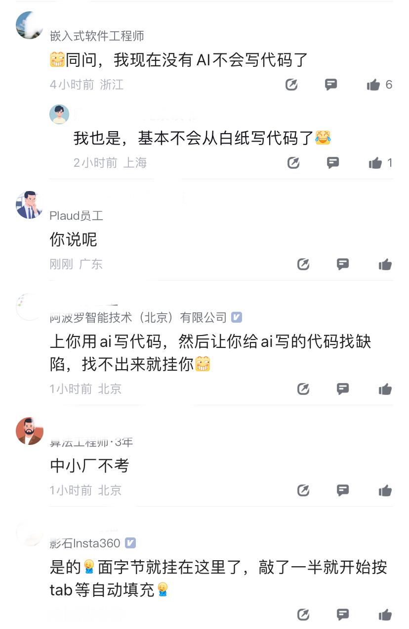 这不对吧?腾讯员工表示,自己99%的代码都是AI写的,但在讨论现在社招还要不要考coding时,评论区都说,必考!甚至还有影石员工表示,“自己面试字节就挂在这,敲了一半就开始按tab等自动填充”。所以,时代都变了,为什么还要考算法题?