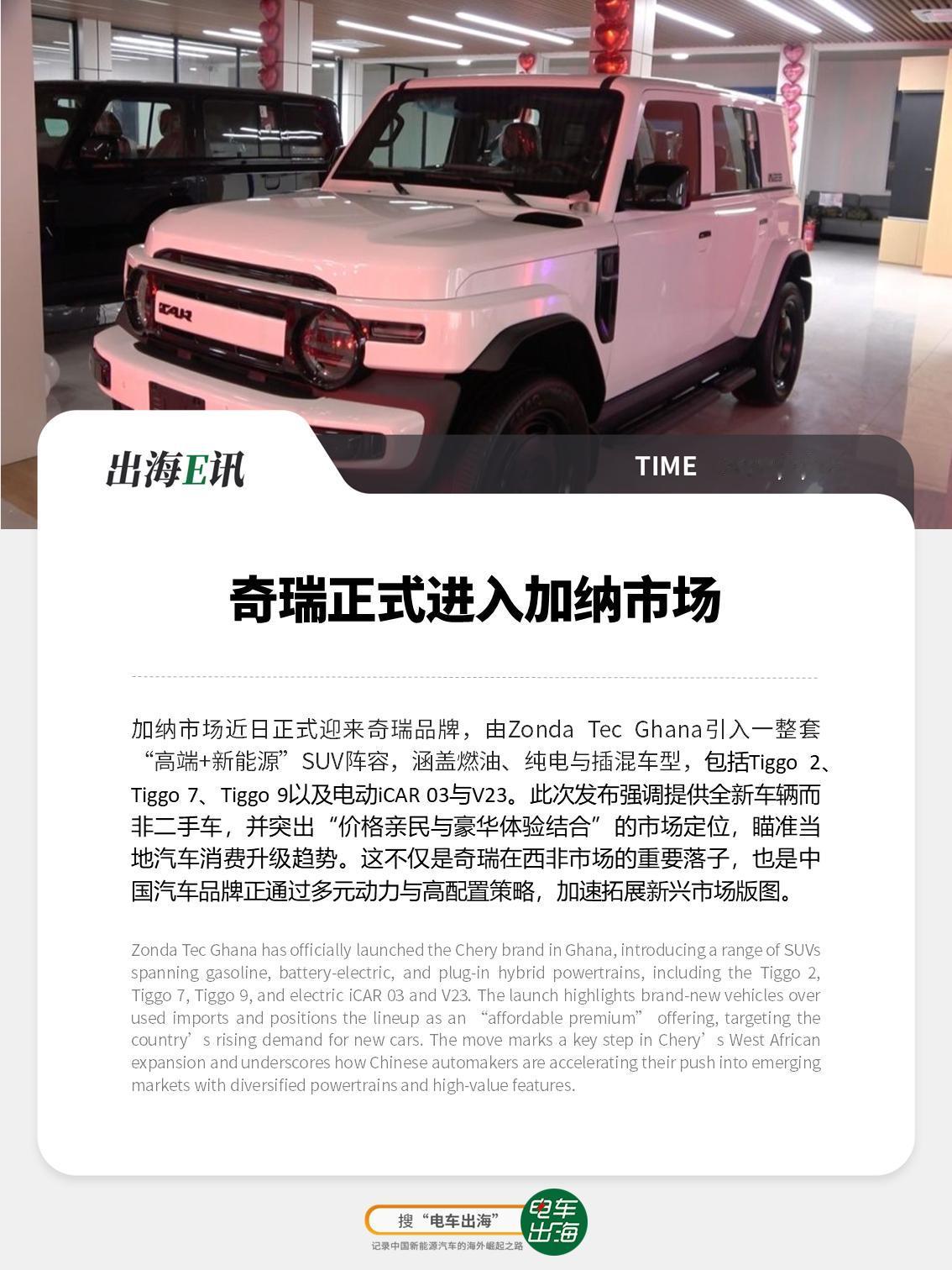 【出海E讯】奇瑞正式进入加纳市场 加纳市场近日正式迎来奇瑞品牌,由Zonda Tec Ghana引入一整套“高端+新能源”SUV阵容,涵盖燃油、纯电与插混车型,包括Tiggo 2、Tiggo 7、Tiggo 9以及电动iCAR 03与V23。 此次发布强调提供全新车辆而非二手车,并突出“价格亲民与豪华体验结合”的市场定位,瞄准当地汽车消费升级趋势。 这不仅是奇瑞在西非市场的重要落子,也是中国汽车品牌正通过多元动力与高配置策略,加速拓展新兴市场版图。