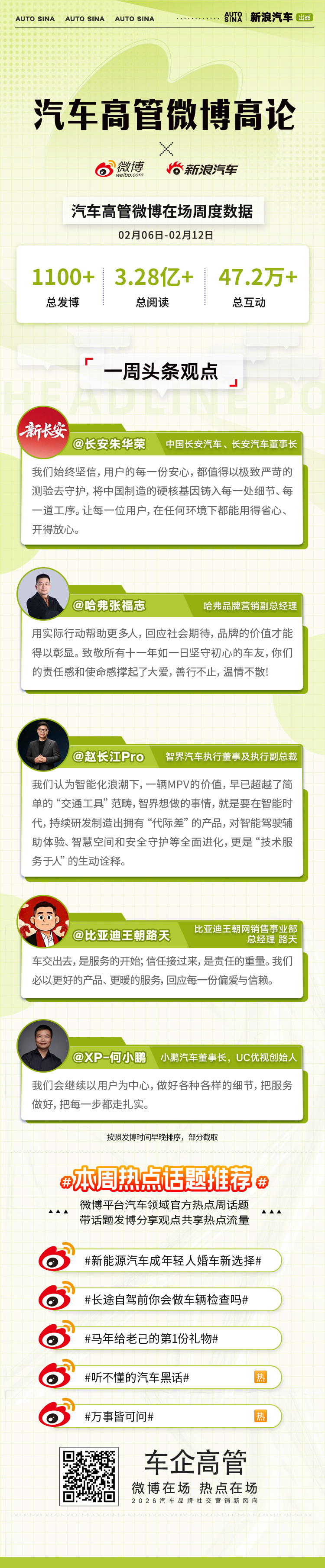 将智能技术转化为温暖体验,让汽车成为承载用户情感与信任的同行伙伴。汽车高管微博高论,省流速览微博一周高管精彩观点!