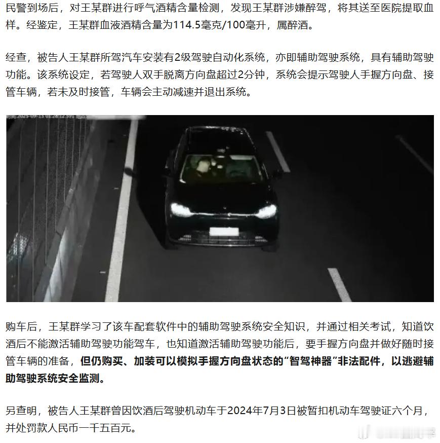 最高法明确辅助驾驶情形下刑事责任认定 很有代表性的一个判决案件。其中的重点:1、属于L2级辅助驾驶,所以责任人仍然是驾驶员;2、学习了辅助驾驶知识并参加考试,厂家属于“已经告知辅助驾驶不能使用的场景”,其中包括饮酒后,并且也知道激活辅助驾驶后需要“手握方向盘并做好随时接管车辆的准备”3、购买加装非法“辅助驾驶神器”4、按醉酒后危险驾驶判处,被告人王某群犯危险驾驶罪,判处拘役一个月十五日,并处罚金人民币四千元