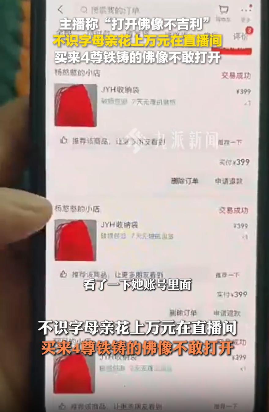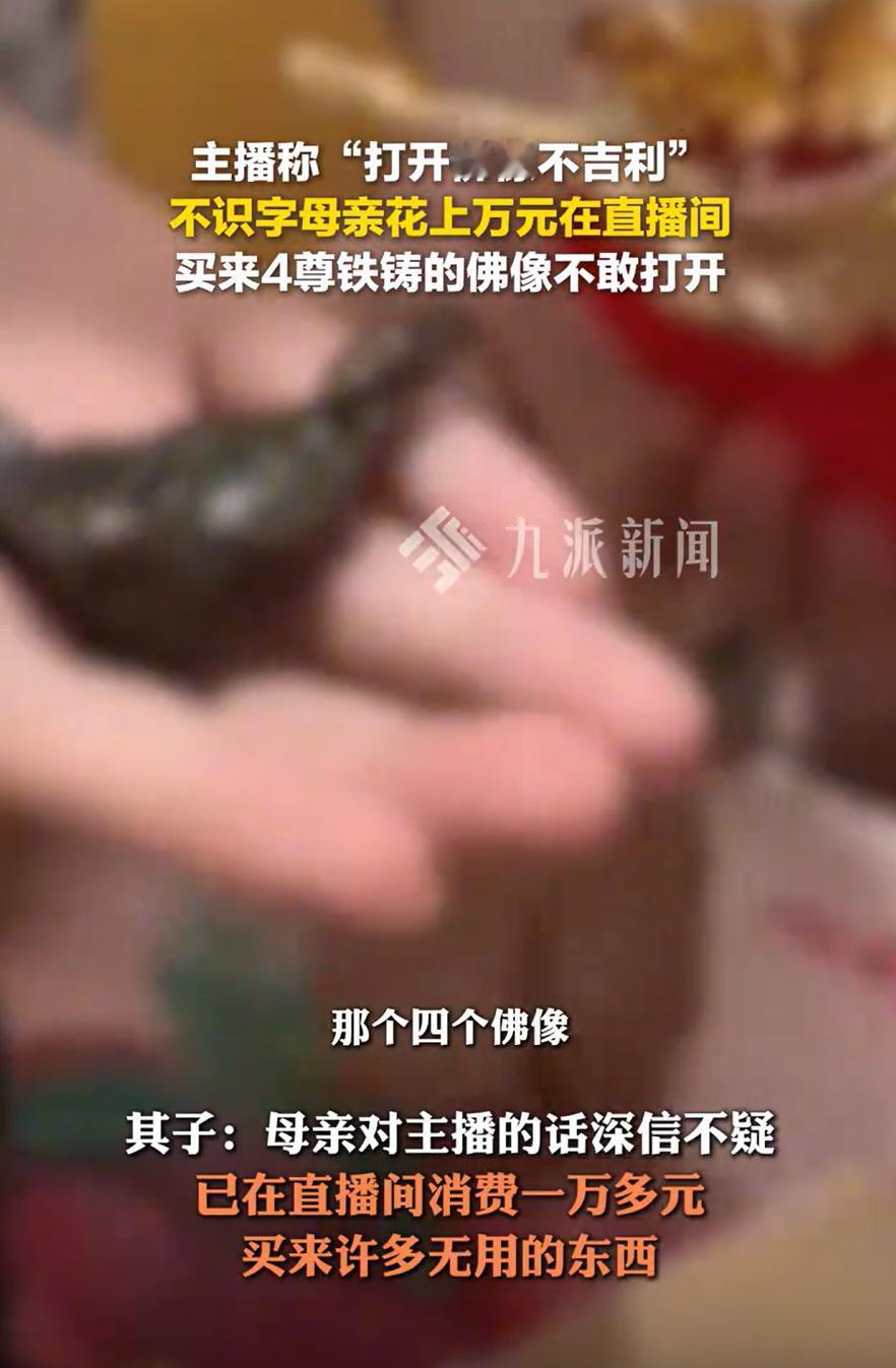 甘肃,一女子不认字,在看直播时花上万元买了4尊佛像,当时主播告诉她“打开佛像不吉利”,女子深信不疑,从佛像拿到手就没打开过箱子,后来儿子得知此事,直接把箱子拆开,结果发现里面的竟然是4尊铁铸的佛像 男子介绍,他在兰州打工,母亲带着孙子在老家。为了让老人方便给孩子买东西,儿子给母亲买了智能手机,教她用微信支付。家里那头牛卖了两万块,就存在母亲的微信零钱里,想着她要是买什么东西,点点屏幕就好了 一次回家时,儿子发现一个没拆封的快递箱。那箱子放在老家的柜子上,落着薄薄一层灰。四尊佛像,铁铸的,沉甸甸,包装完好,连封口的胶带都没撕 母亲说,主播讲了,打开佛像不吉利,得等半年 儿子当场把箱子拆了。他后来在视频平台上翻母亲的购买记录,发现她已经在不同的直播间花掉了一万多。除了佛像,还有吊坠、蜂王浆、苗银碗筷,杂七杂八堆在家里 他把这件事发到了网上。没过多久,那个卖佛像的主播主动找过来,道歉,退款,态度好得像什么都没发生过 儿子把这件事曝光后,很多人评论说,为什么不早点教老人防骗。其实教过。儿子说,他跟母亲讲过很多次,不要轻信直播里的人。但老人看直播间,有时候一坐就是一个下午。主播喊一声阿姨,聊几句家常,讲讲家里难处,讲讲积德行善,她就觉得那是熟人,不会骗她 看到这个事,我觉得我们要学会用更理性的眼光看待直播购物,保持冷静,学会质疑。而在这个过程中,家人之间的关心和相互提醒也至关重要。就像这个儿子,他不仅及时拆开了包装,发现了问题,还为母亲挽回了损失