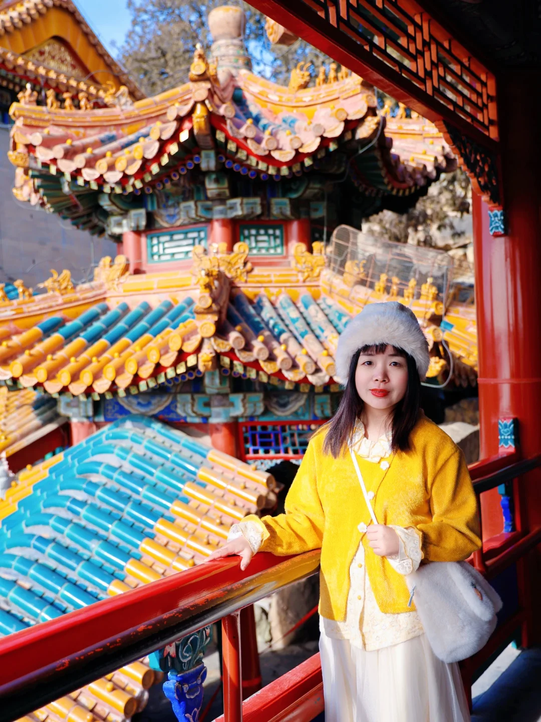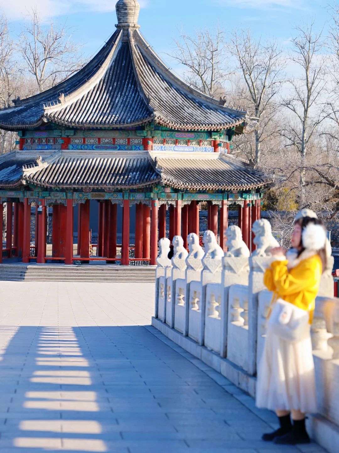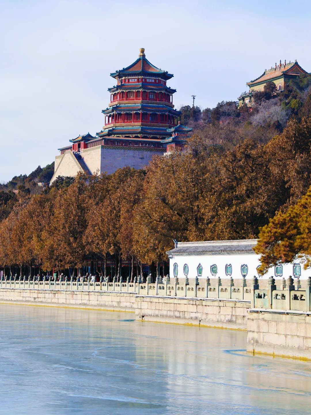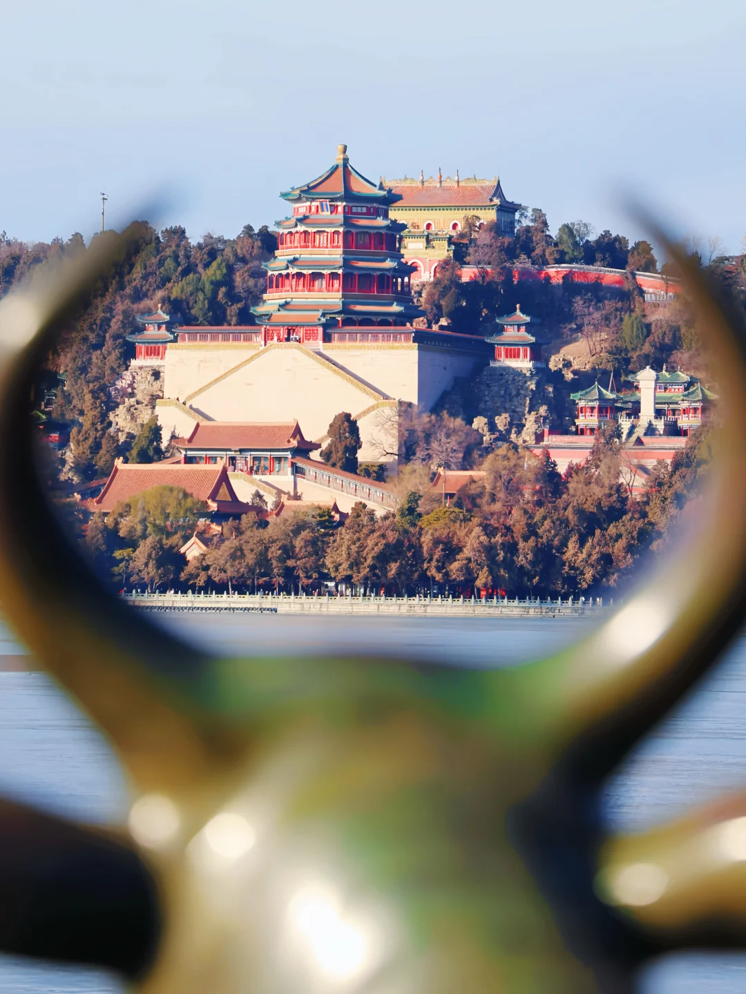 2. 画中游:红墙金瓦+昆明湖全景,用门窗做前景,人站在栏杆边回眸,随手拍都是大片
