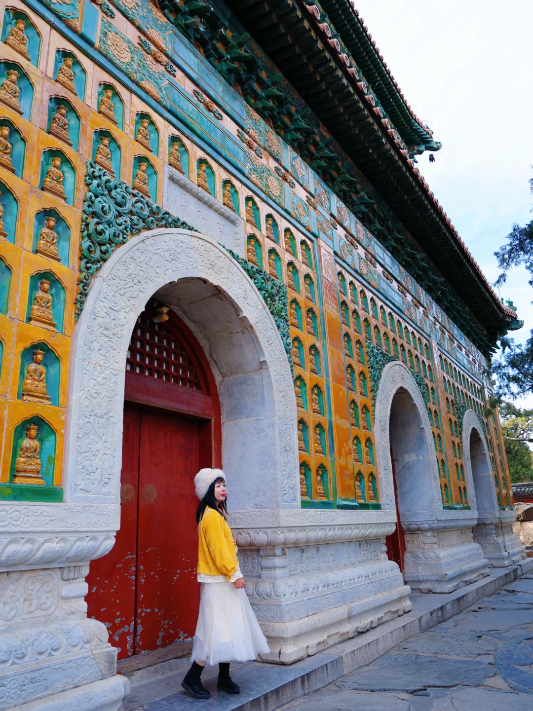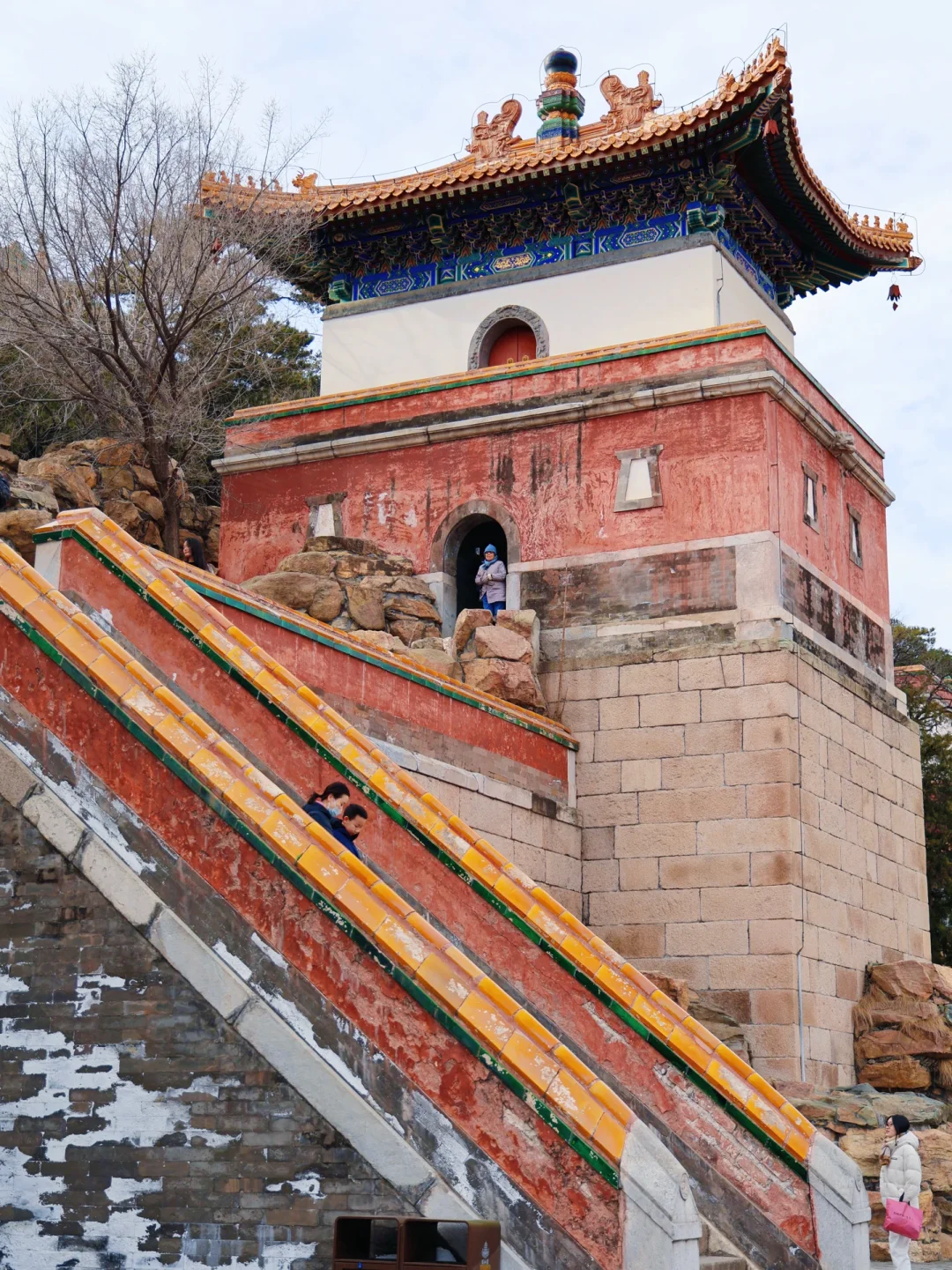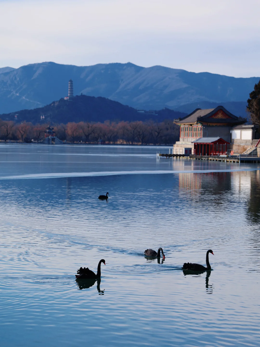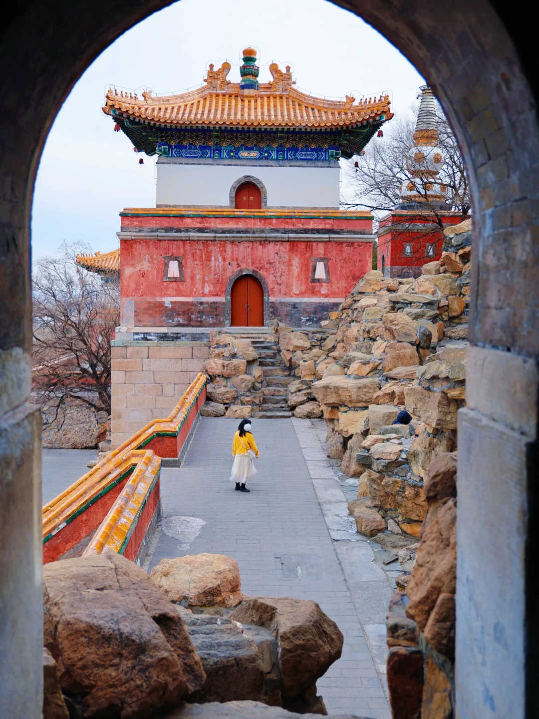 2. 画中游:红墙金瓦+昆明湖全景,用门窗做前景,人站在栏杆边回眸,随手拍都是大片