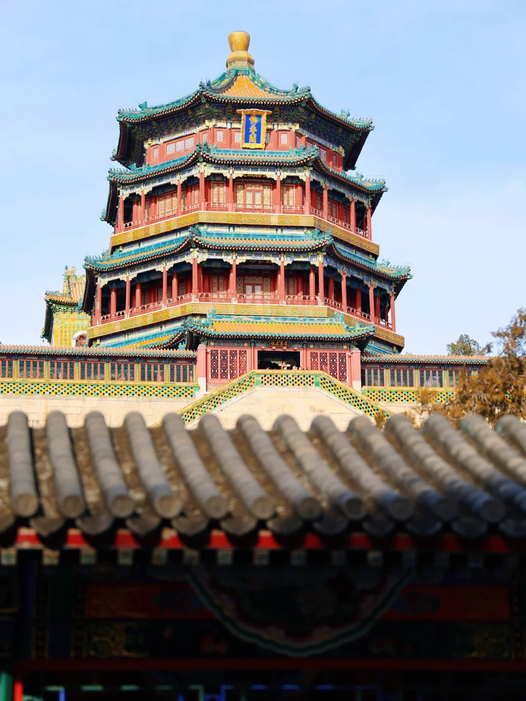 4.佛香阁:登楼可俯瞰昆明湖和十七孔桥,低角度仰拍,超绝中式建筑美学