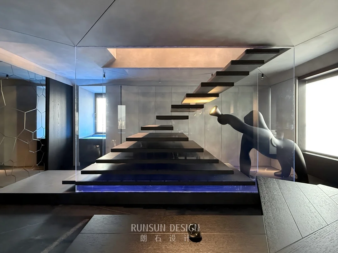 在这个未来感的先锋主义私宅, 以 “光与影、硬与软、秩序与自由” 为核心, 将未来感与艺术感深度融合: ○ 材质与色彩的碰撞; ○ 光影与结构的叙事; ○ 艺术装置的点睛。