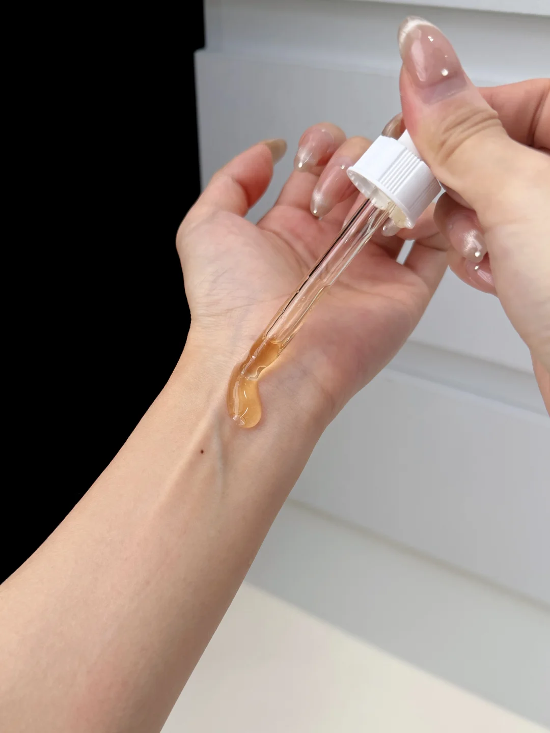 在洁面后2-3滴分别点在眼周,用无名指轻轻打圈按摩(这个手法一定要轻哦,眼周皮肤太脆弱,用力拉扯反而容易长细纹)。按摩十几秒就能完全吸收,吸收后会有一点淡淡的紧绷感,不是那种拔干的不适,是皮肤被轻轻“提”起来的紧致感。
