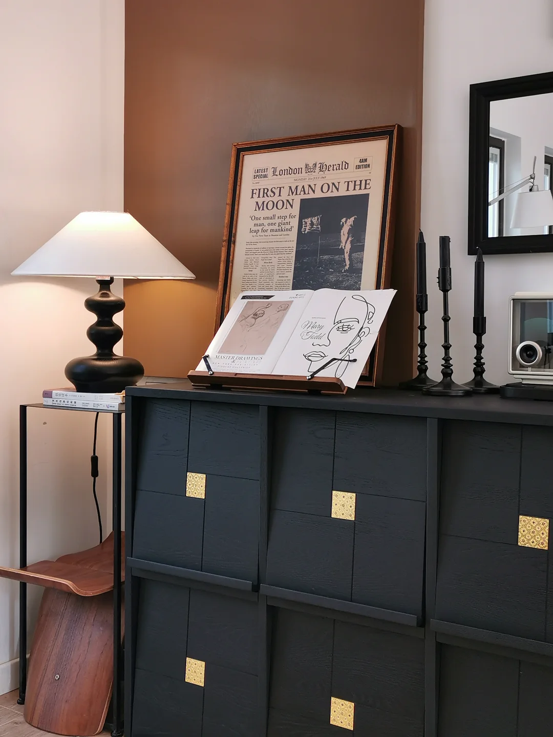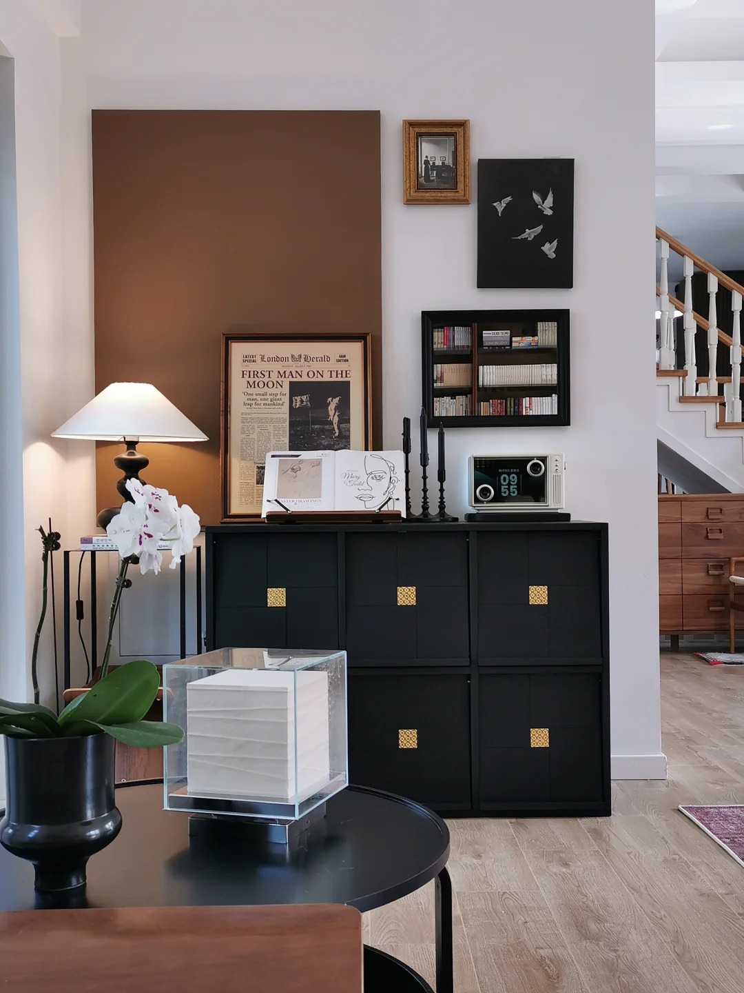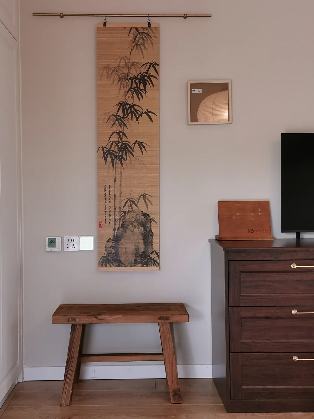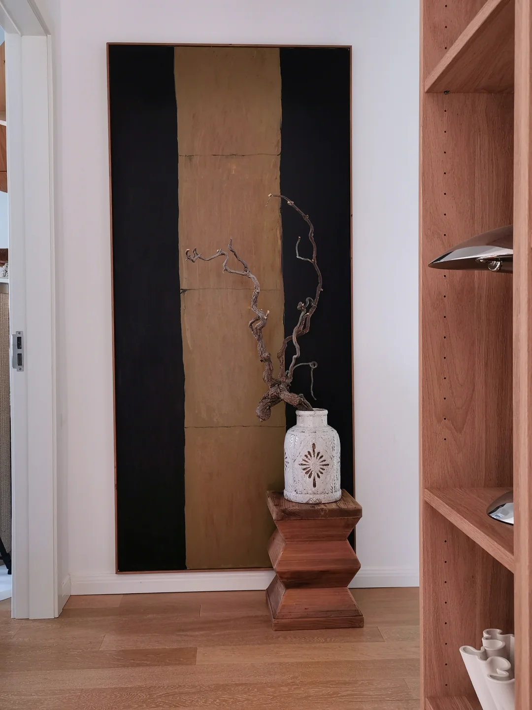 图11:黑框免装裱的空白画布➕条凳➕花瓶和龙枣枝