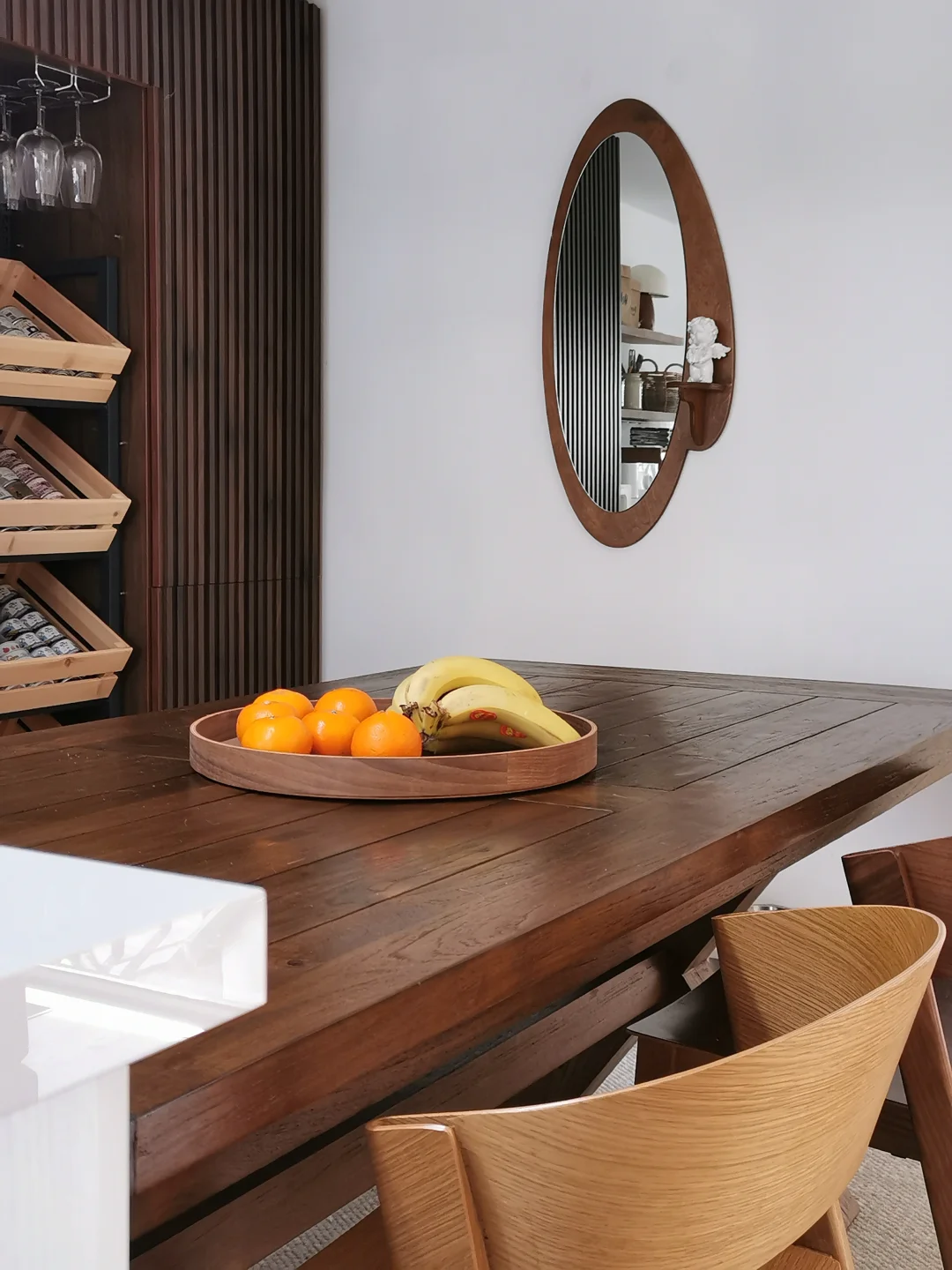 图7: 木质镜面,椭圆形木板加两块小支架用琥珀色木蜡油涂抹上色,椭圆镜子用免钉胶固定在木板上