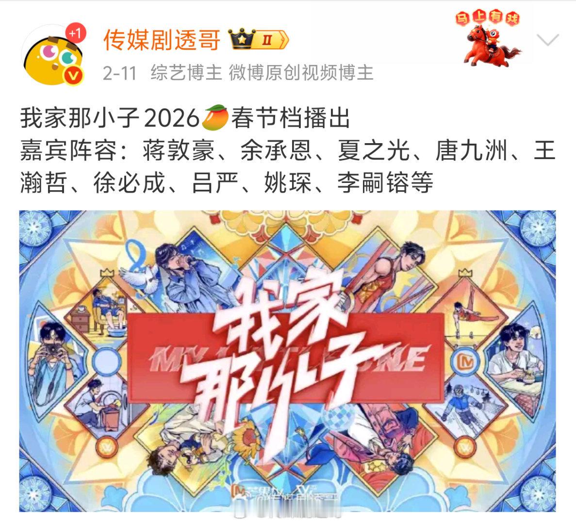 恭喜《我家那小子2026》今日份官宣定档首期嘉宾:蒋敦豪、余承恩、王瀚哲、夏之光我家那小子定档大年初六