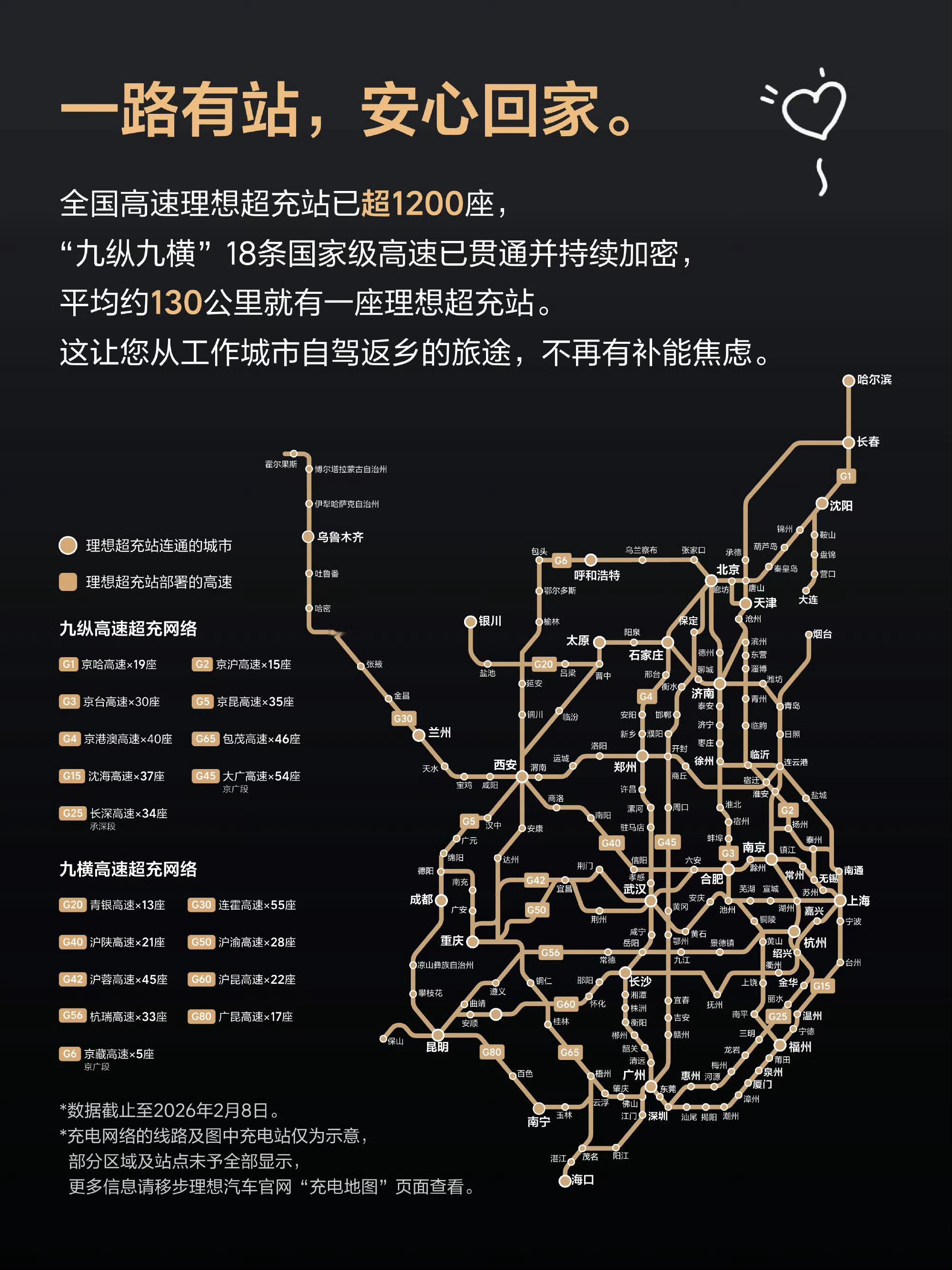 其中高速1200站,连通九横九纵十八条国家级高速,平均132公里一座,纯电长途出行,安心很多。理想汽车理想i8因为超充所以理想 抽奖详情