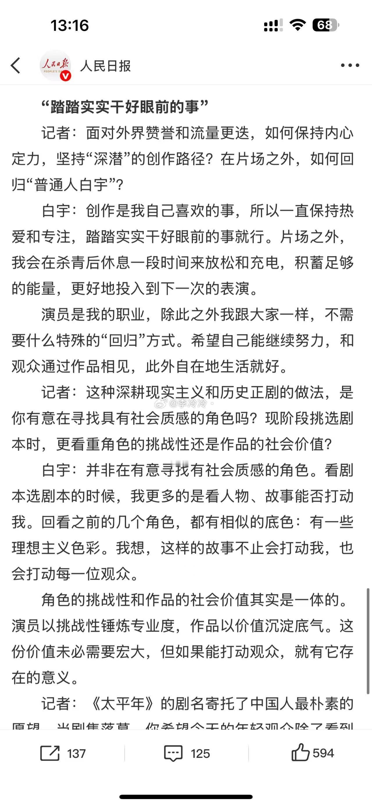 对话太平年主演白宇白宇在太平年里演的就是好啊,看了他的采访内容,更理解为什么他能演这么好了,把剧本看透,把角色吃透,再加上他很扎实的演技功底,自然就成功驾驭啦~恭喜白宇又拿到代表作和代表角色~