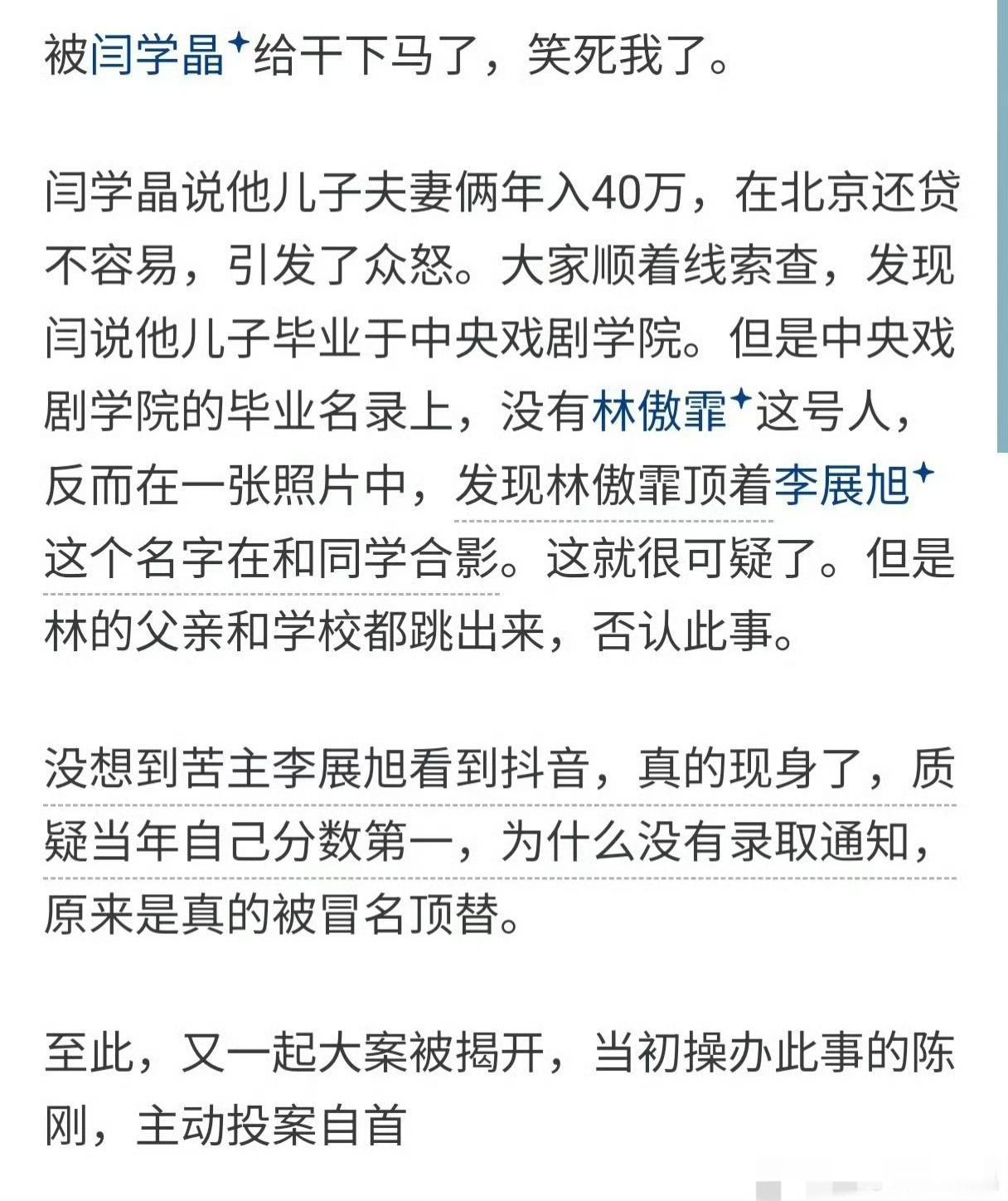 曝闫学晶三位亲属都在中戏。 演员闫学晶的三位亲属——儿子林傲霏、继女林傲雪、侄子闫浩博均被曝毕业于中央戏剧学院,引发公众对其家族是否利用特权挤占教育资源的质疑,一年25个名额,是几千个艺考生从凌晨四点排队、练到声带充血换来的。不是谁家的内部指标。闫学晶家,三位亲属,三位中戏,概率上这叫奇迹,现实里这叫疑问。2012年那场考试,到底是谁,替谁,上了大学。 跨界女王闫学晶 闫家晶 闫学晶演技争议