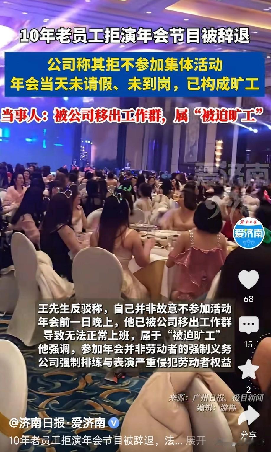 武汉十年老员工,就因为不想上台演年会节目,直接被公司以不服从管理开除。我看完真的气笑了,上班是来干活的,不是来卖艺的。 法院判得太解气,年会表演根本不是本职工作,公司开除属于违法解除,最终赔了18万多。我觉得职场就该讲边界,别拿集体情怀绑架个人意愿,管理不能越法律的红线。 你们公司年会有啥离谱强制安排?评论区聊聊。
