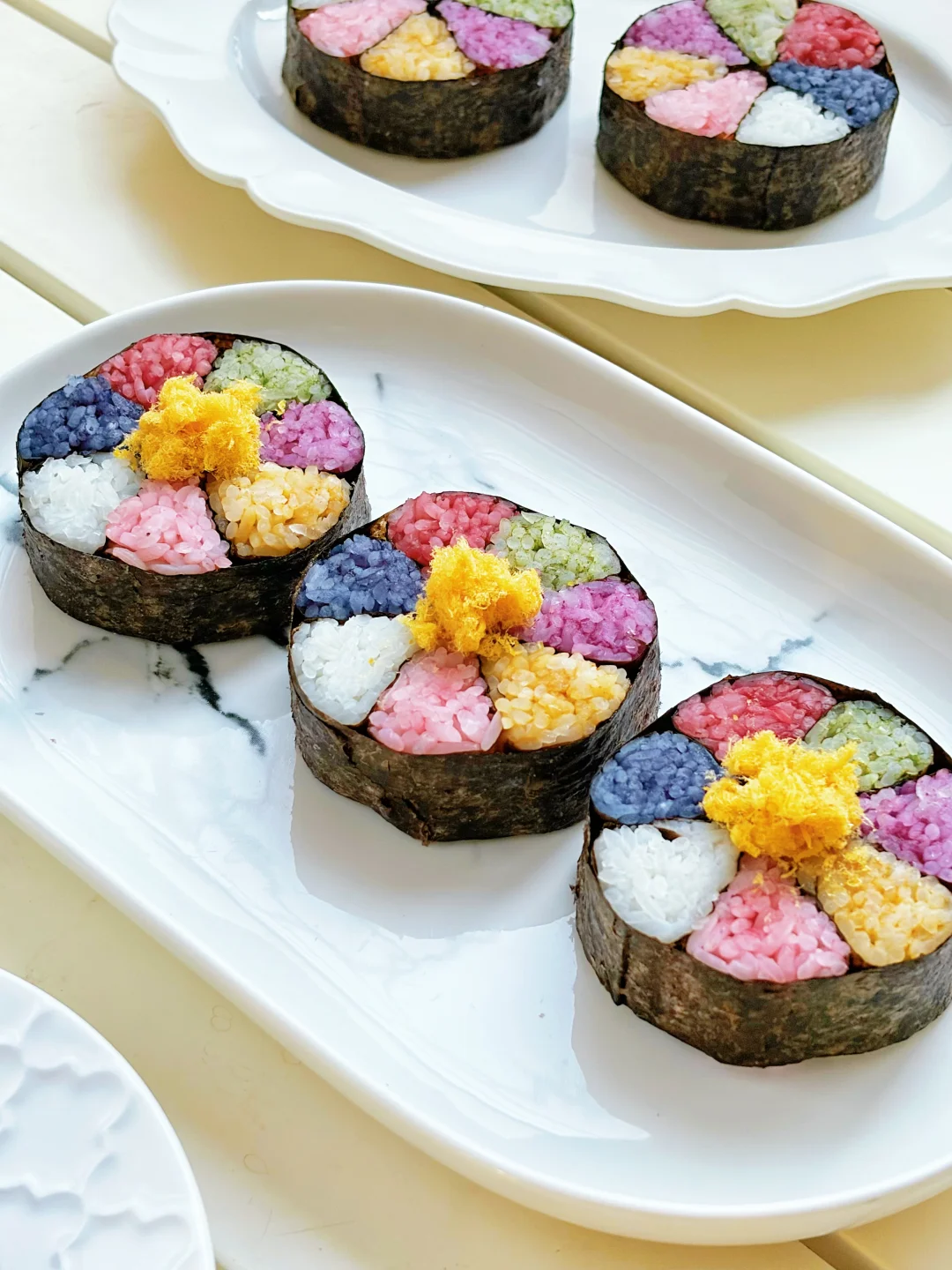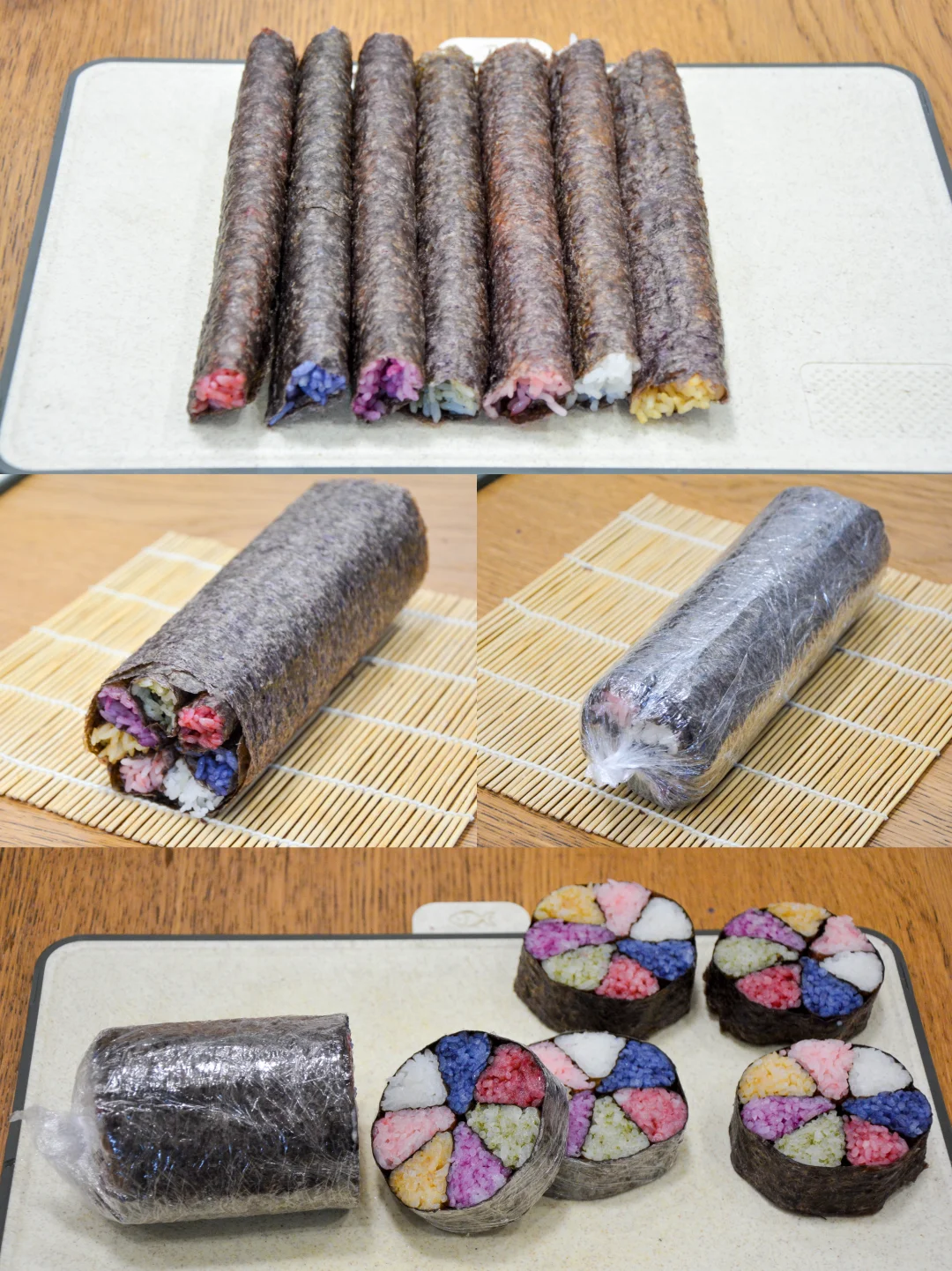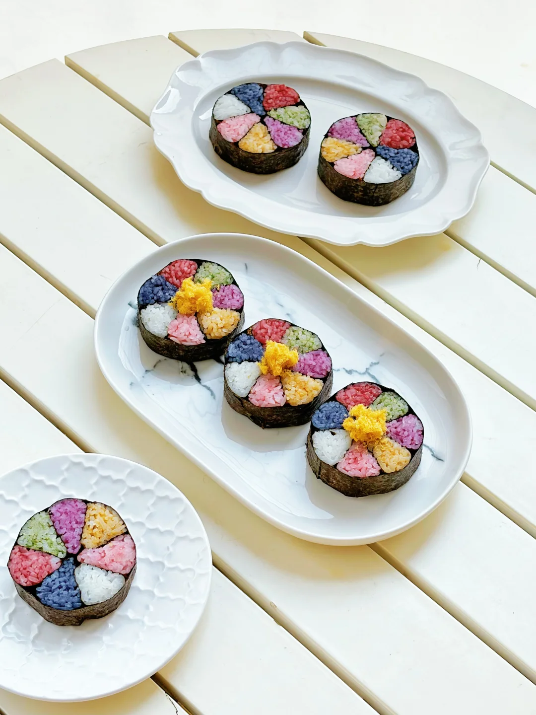 过年啦,做一条七彩米饭卷,切块摆盘,像盛开的花朵一般亮眼。