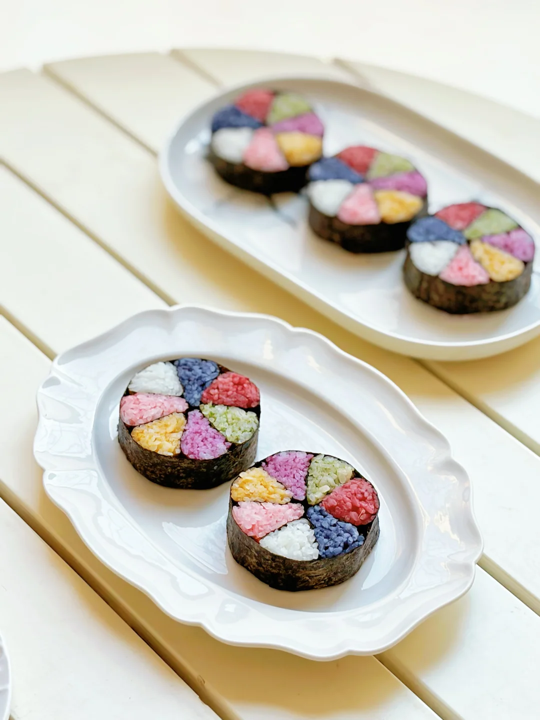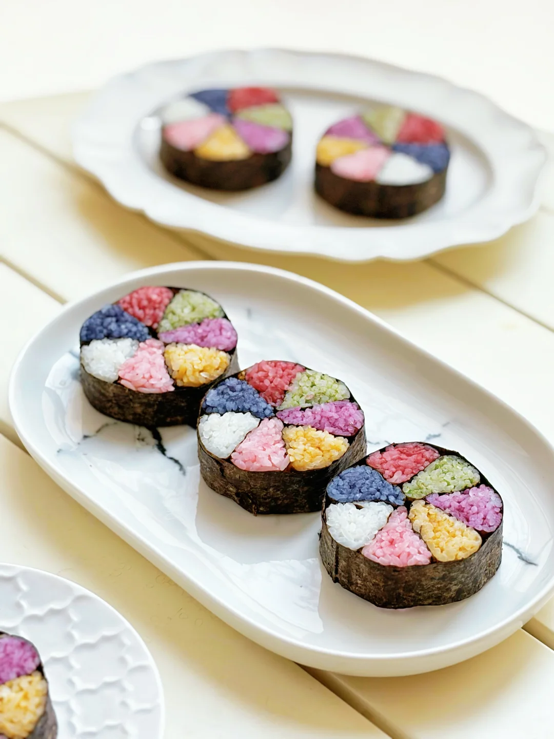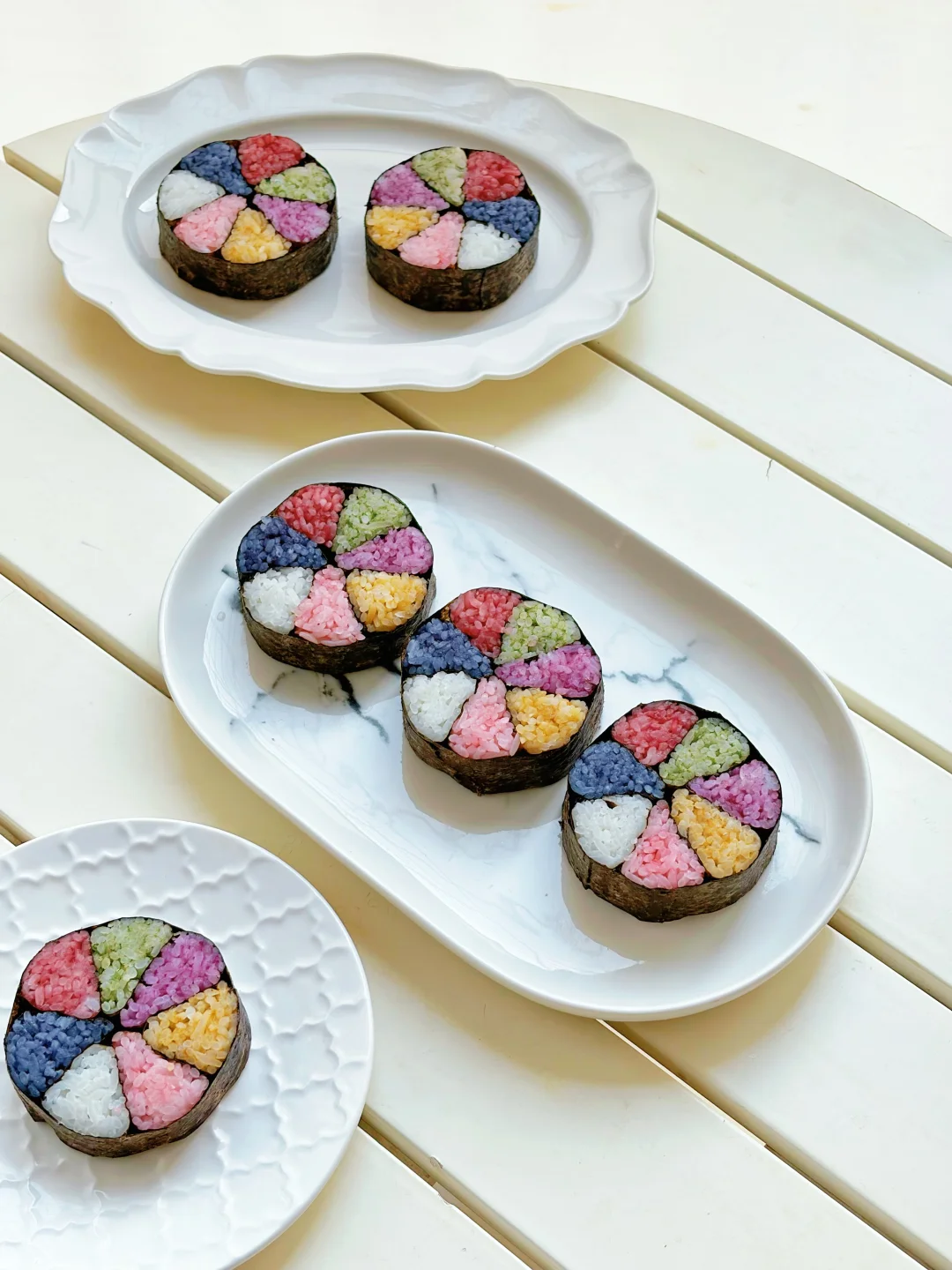 过年啦,做一条七彩米饭卷,切块摆盘,像盛开的花朵一般亮眼。