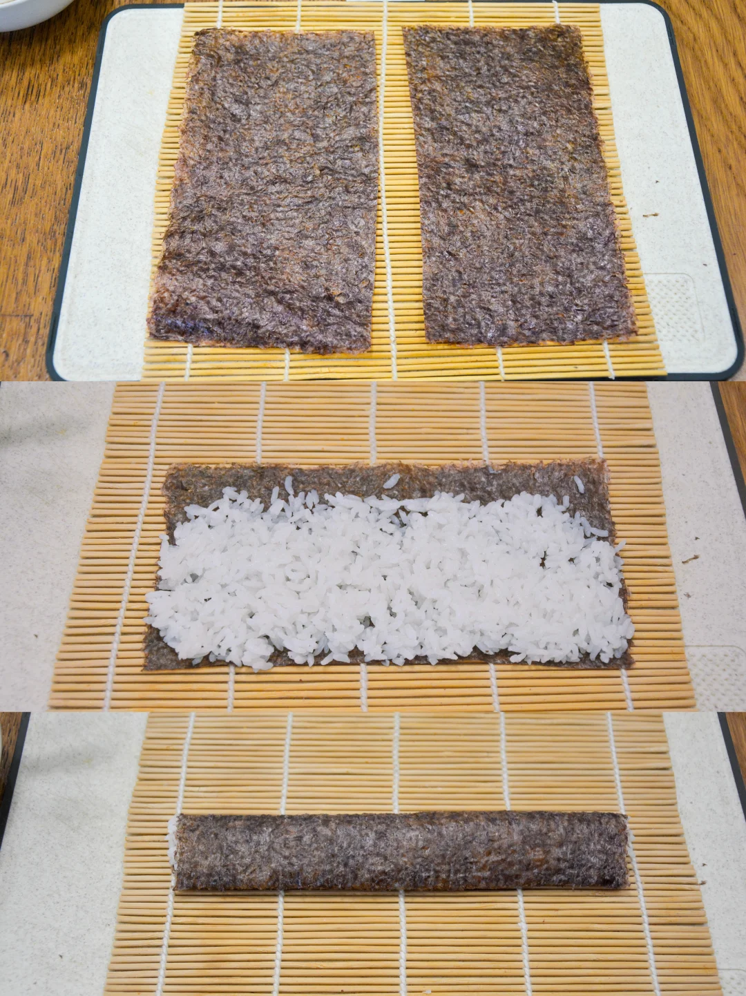 2. 寿司海苔片剪成两半;