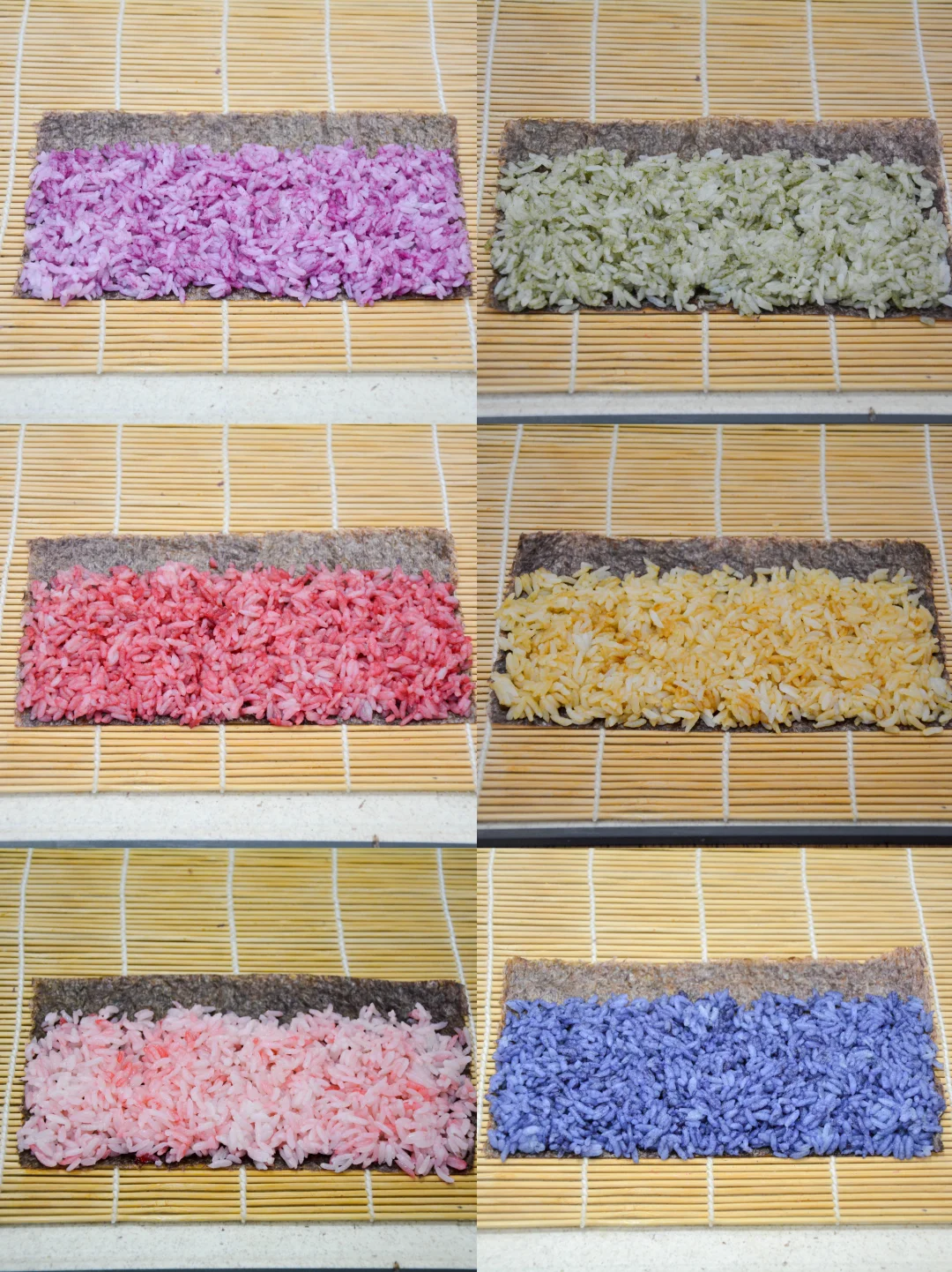 1. 蒸熟的五常大米饭分7份,每100克一份,6份分别撒入果蔬粉、淋3克左右的寿司醋或白米醋拌匀;