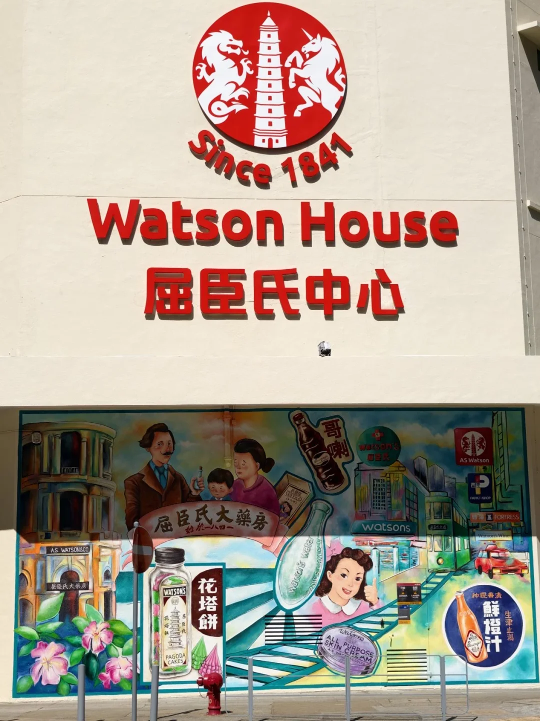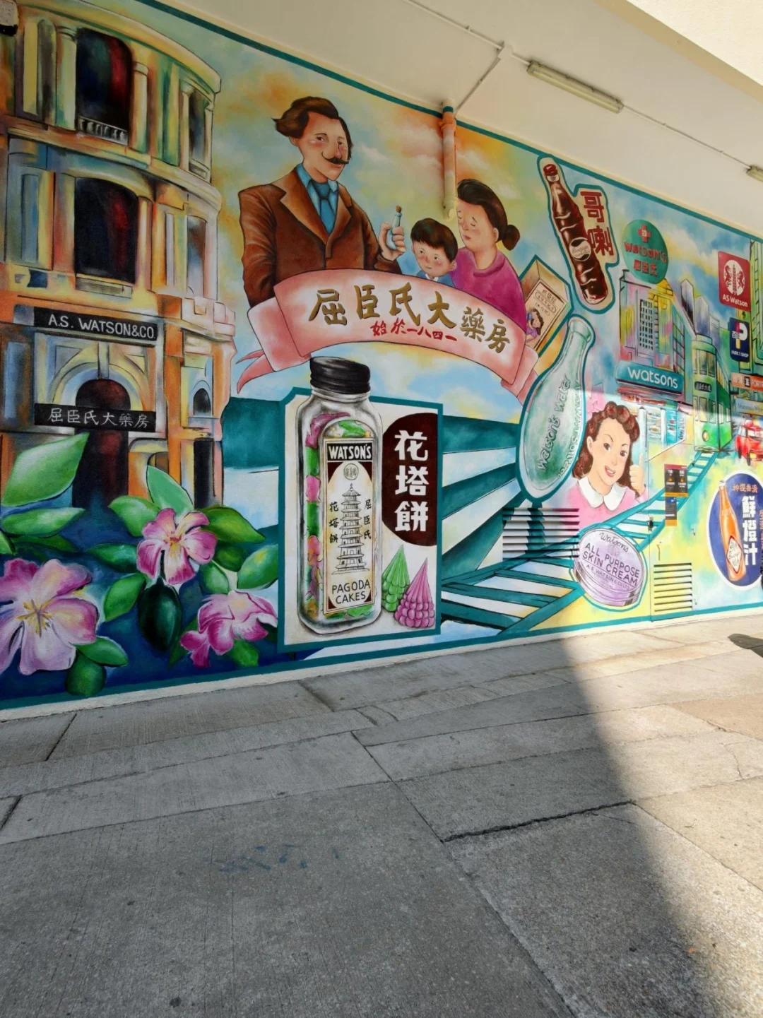 本来是去火炭拍工业风照片的📸 结果香港新界火炭禾寮坑道1-5號的这面墙成了我的意外惊喜 📸 复古画风直接把屈臣氏集团185年的历史都画活了 帮我拍照的摄影师说这面墙的色彩和构图太出片了,一拍就是下午哈哈哈