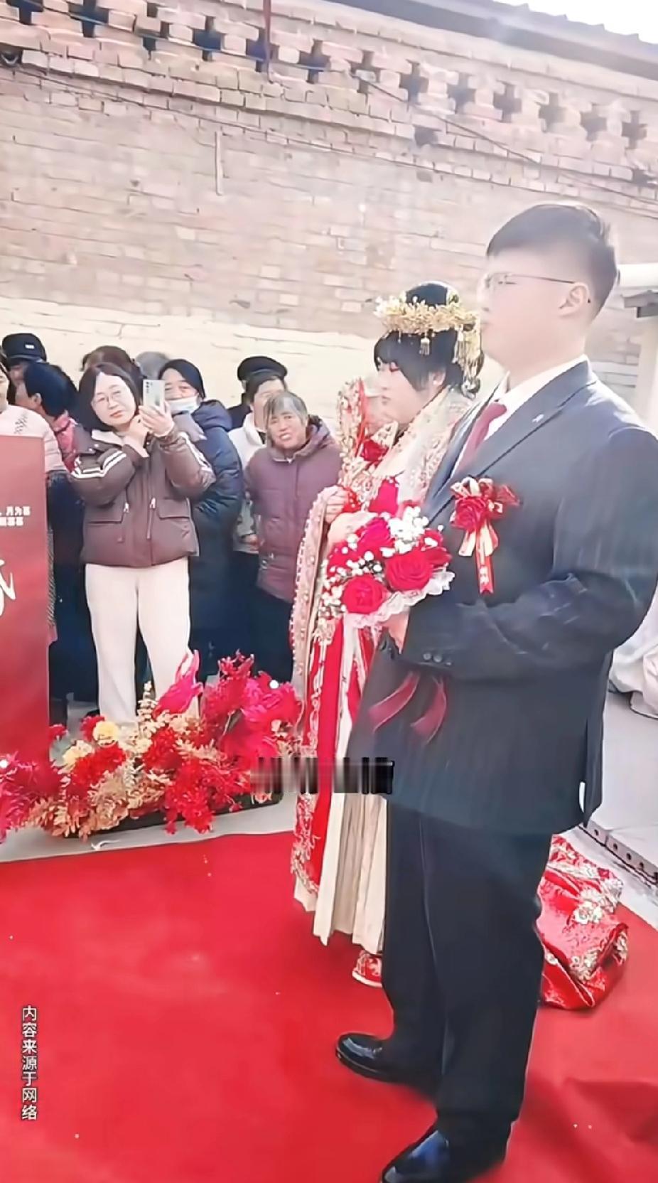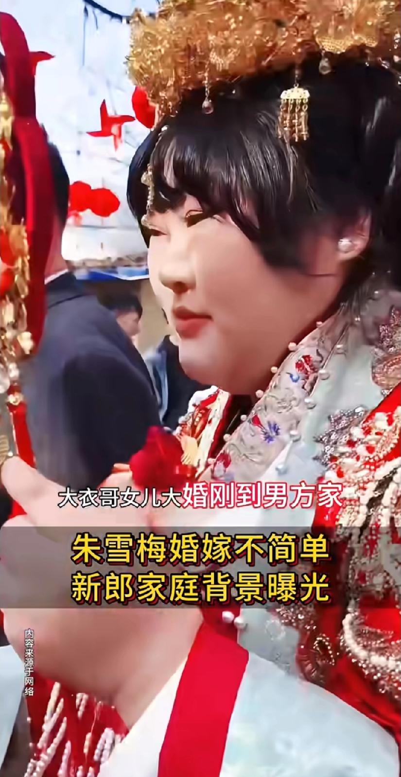 大衣哥女儿大婚,网友吵翻:这也叫“门当户对”?🤔 今天大衣哥朱之文的女儿朱雪梅出嫁,全网都在看! 雪梅一身红金婚服,凤冠霞帔,手里的团扇都快攥不住了,看得出来是真紧张又真开心。新郎是邻村小伙李建伟,戴个眼镜,斯斯文文,据说当过兵,退伍后搞建材生意,家底不算大富大贵,但胜在踏实肯干。 可评论区却炸了锅: “大衣哥家大业大,怎么就找了个普通人家?” “这也太不般配了吧?” “是不是图大衣哥的名气和钱?” 但大衣哥早就放话:“我嫁女儿,不看家底,就看人品。” 人家要的是能踏踏实实过日子的人,不是什么豪门联姻。 再说了,雪梅自己也说了,就喜欢他老实靠谱,能给她安全感。这年头,真心比什么都金贵。 看着他俩在红地毯上并肩站着,雪梅偷偷笑,新郎满眼都是她,这画面,比任何豪门婚礼都动人。 所以啊,别瞎操心了,人家小两口日子过得甜着呢! 朱雪梅