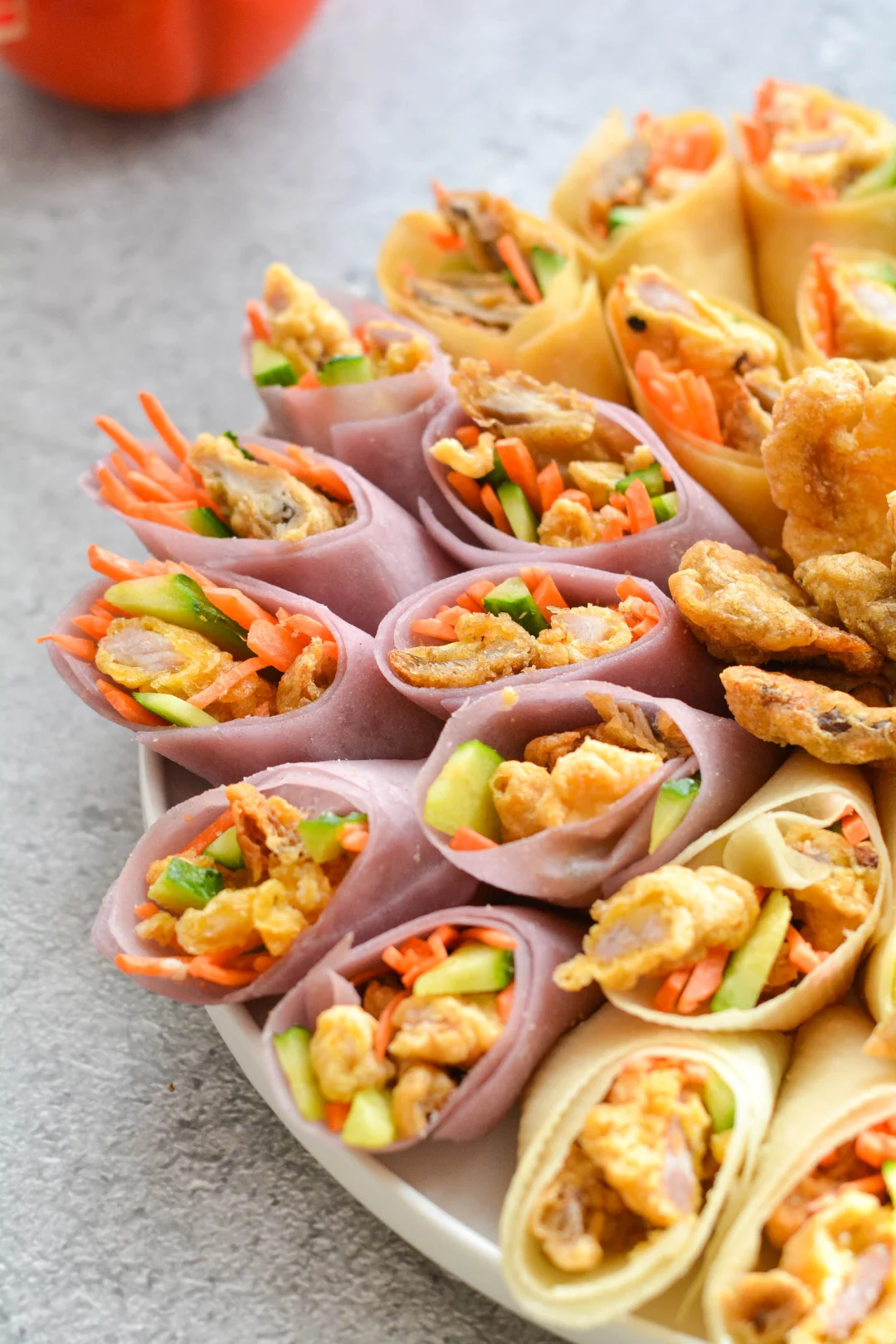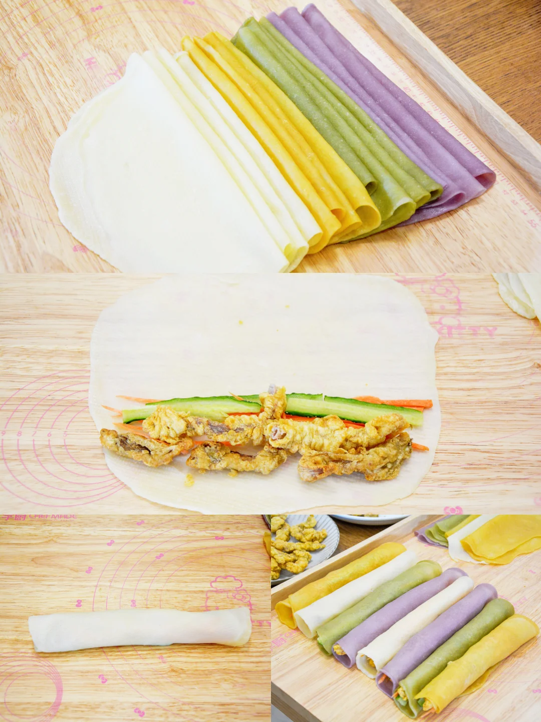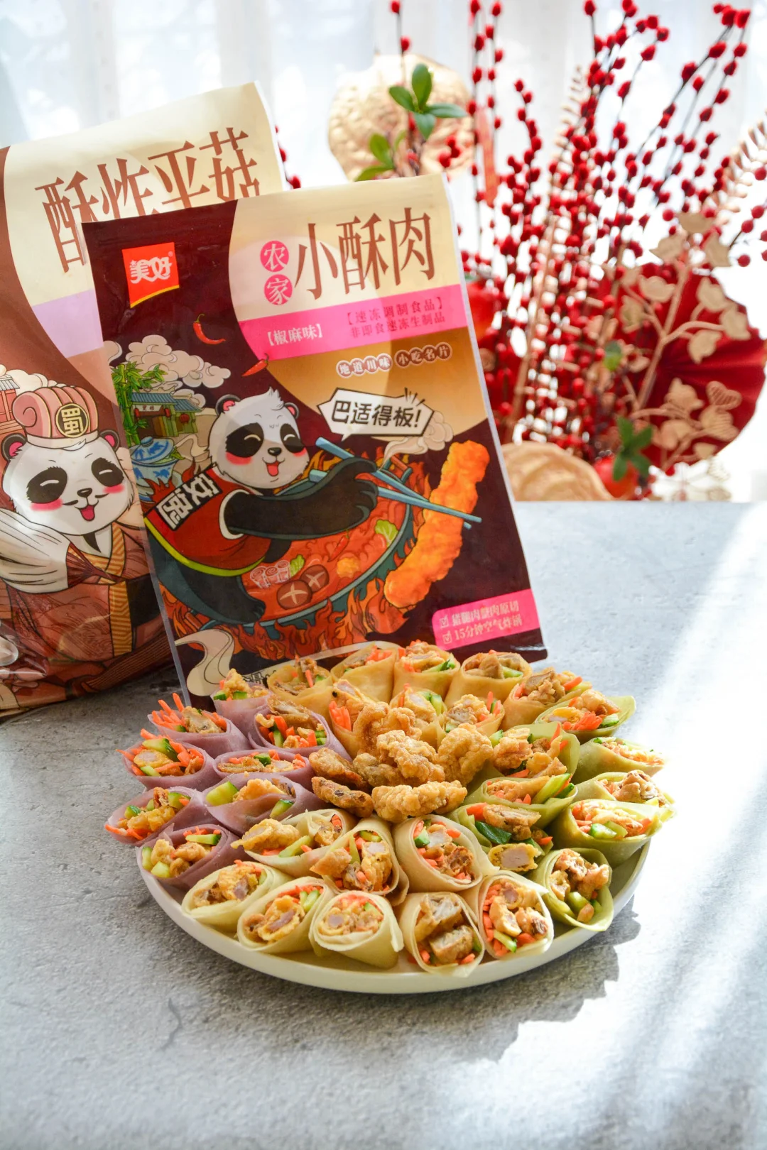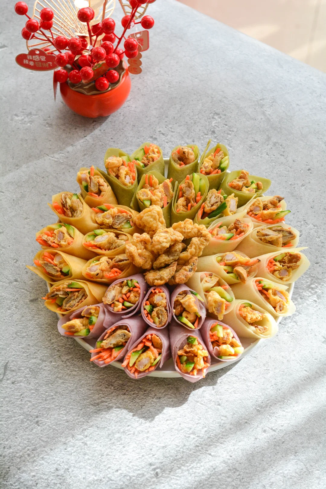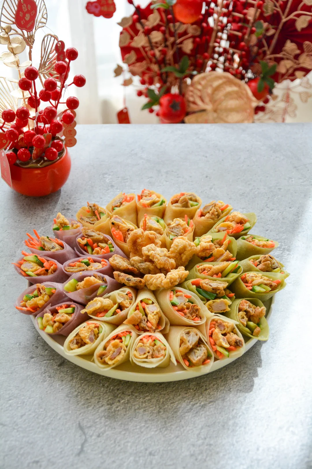 这盘小酥肉卷饼惊艳了全家人。春饼做成四种颜色,对应“四喜”;把美好小酥肉和酥炸平菇卷成卷,寓意圆满美好。无需刻意摆盘,就是一朵富贵花。
