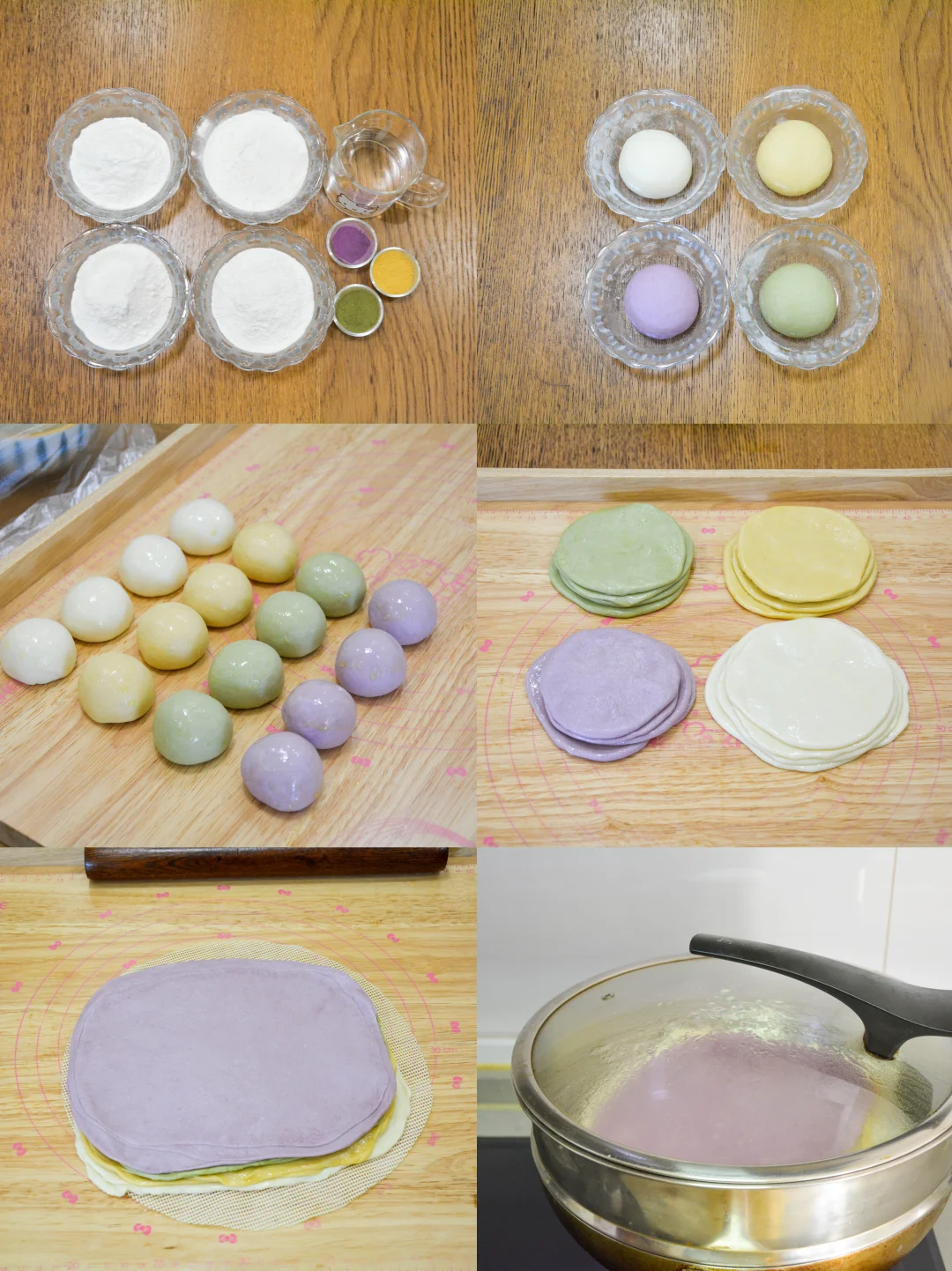 1. 四种颜色面团揉光滑,面粉和水比例100:60;蒙保鲜膜饧30分钟以上使用;