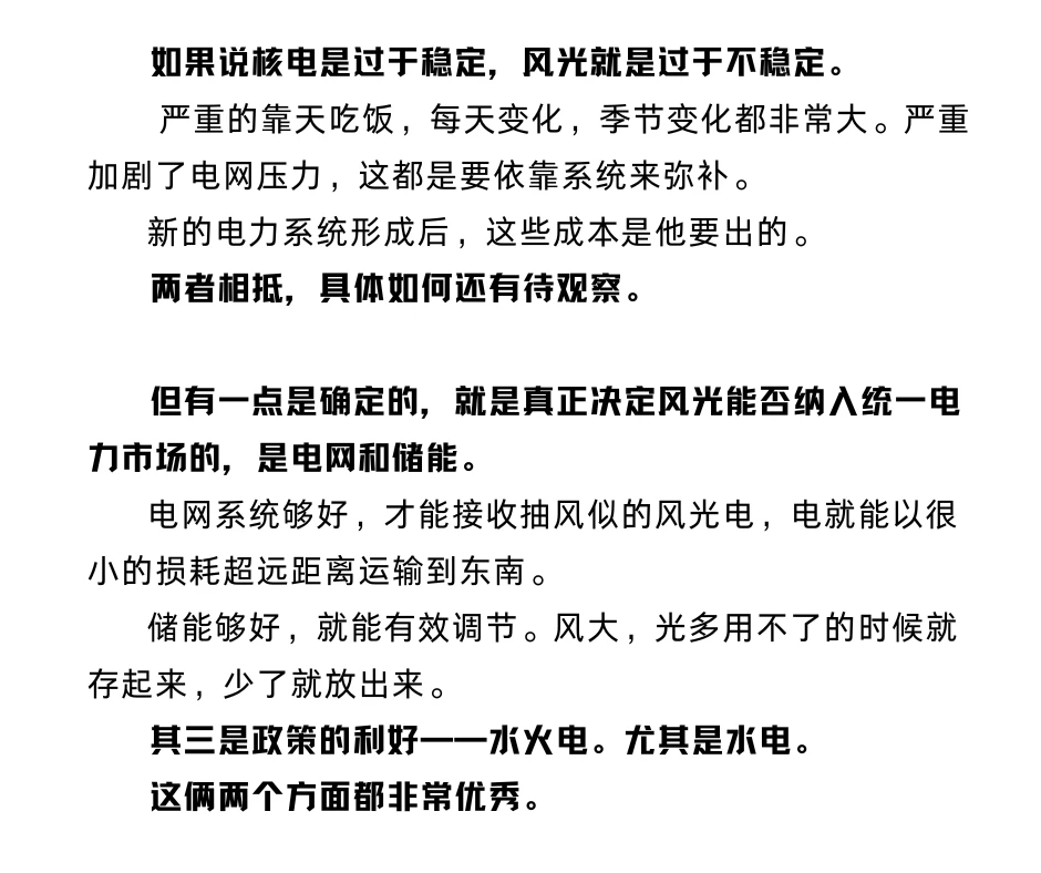如果说核电是过于稳定,风光就是过于不稳定。严重的靠天吃饭。严重加剧电网压力,这都是要依靠其他发电方式或是储能来弥补的。在新的电力系统形成后,这些浪费的成本是他要出的。