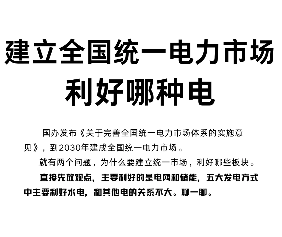 先放观点,利好电网和储能,五大发电方式中主要利好水电,和其他电的关系不大。聊一聊。