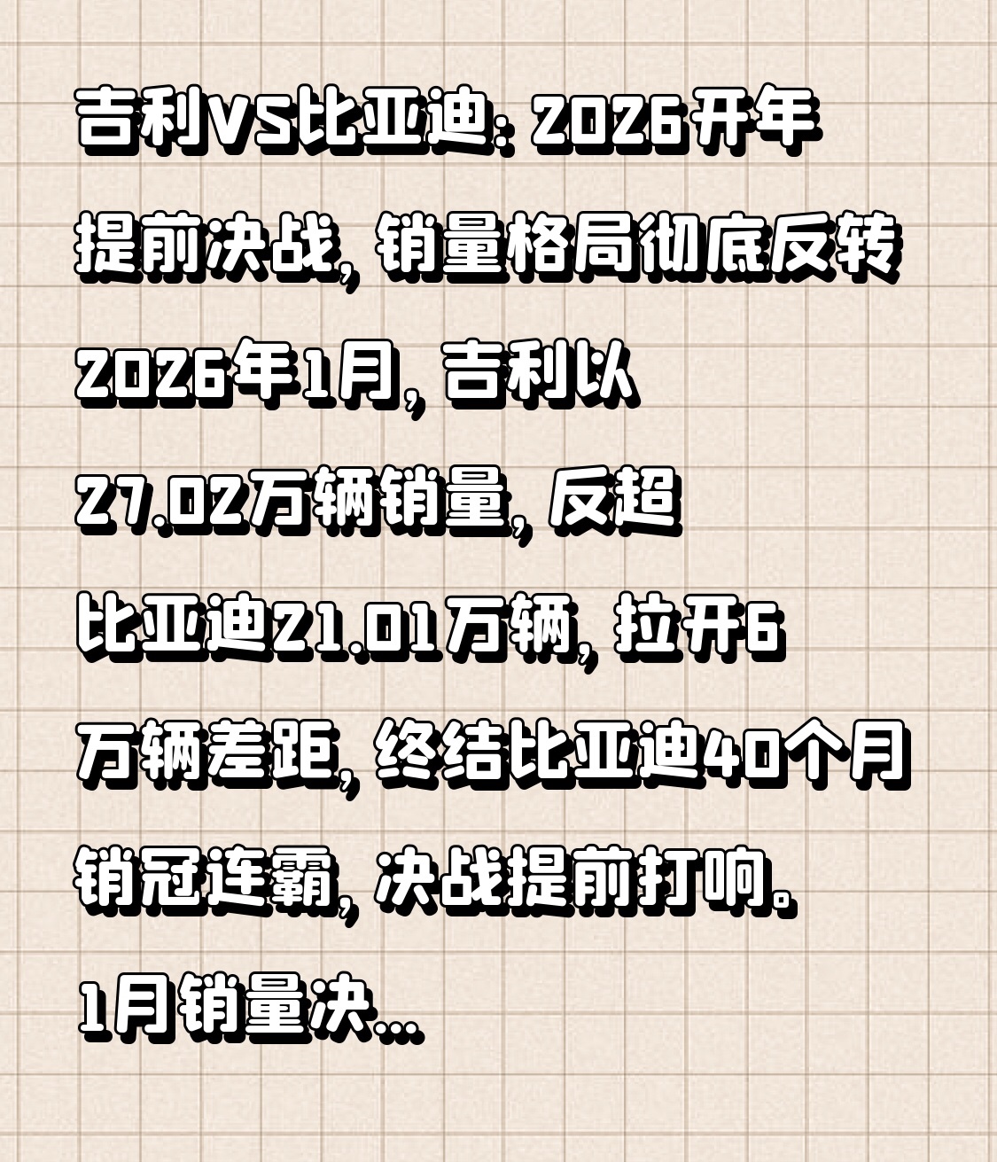 2026年1月,吉利以27.02万辆销量,反超比亚迪21.01万辆,拉开6万辆差距,终结比亚迪40个月销冠连霸,决战提前打响。