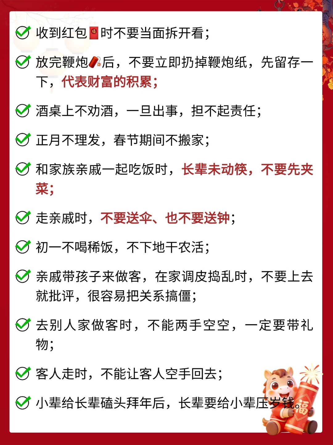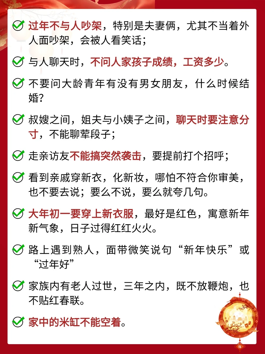 ✅过年不说不开心、不吉利的话,多笑、多说 “新年好”“恭喜发财”,大家都会喜欢你。